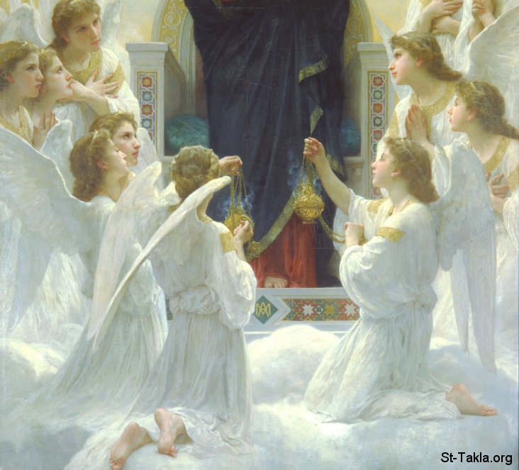 جزء من لوحة العذراء والملائكة (ملكة الملائكة)، رسم الفنان وليام أدولف بوجارو، 1900 م.، زيت على قماش بمثاس 285×185 سم.، متحف بيتي باليه (القصر الصغير)، باريس، فرنسا.