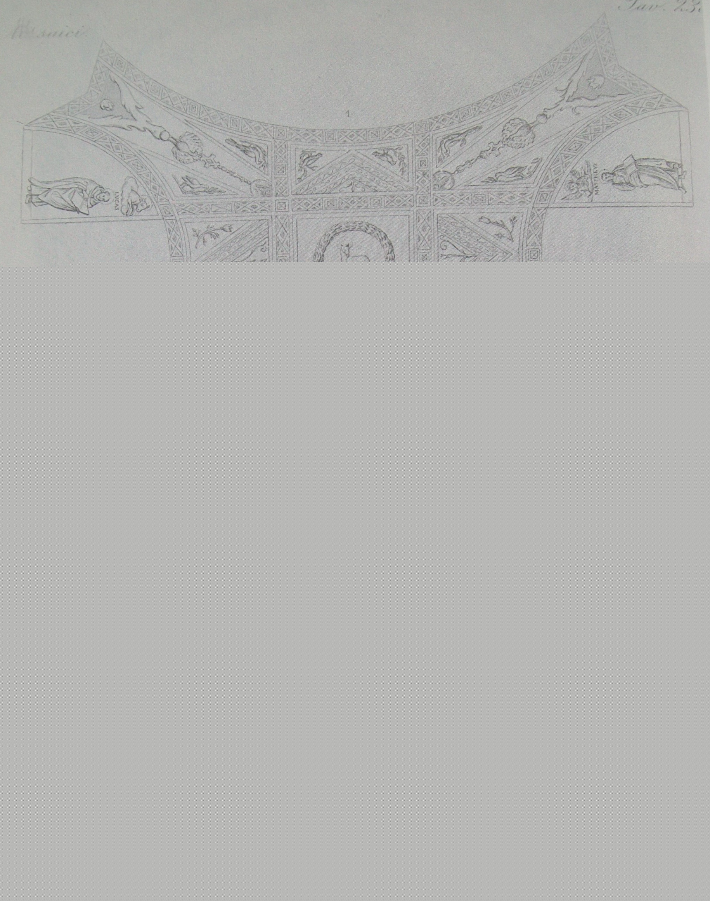 Mosaic picture: at the bottom of the picture, there are the four evangelists, with each having the living creature symbolizing him above his head. From left to right, we find Mark the evangelist with a creature resembling a lion above his head, Mathew the evangelist with a creature resembling a human above his head, Luke the evangelist with a creature resembling a lamb above his head, and John the evangelist with a creature resembling an eagle above his head. The names of the evangelists are written above their heads.