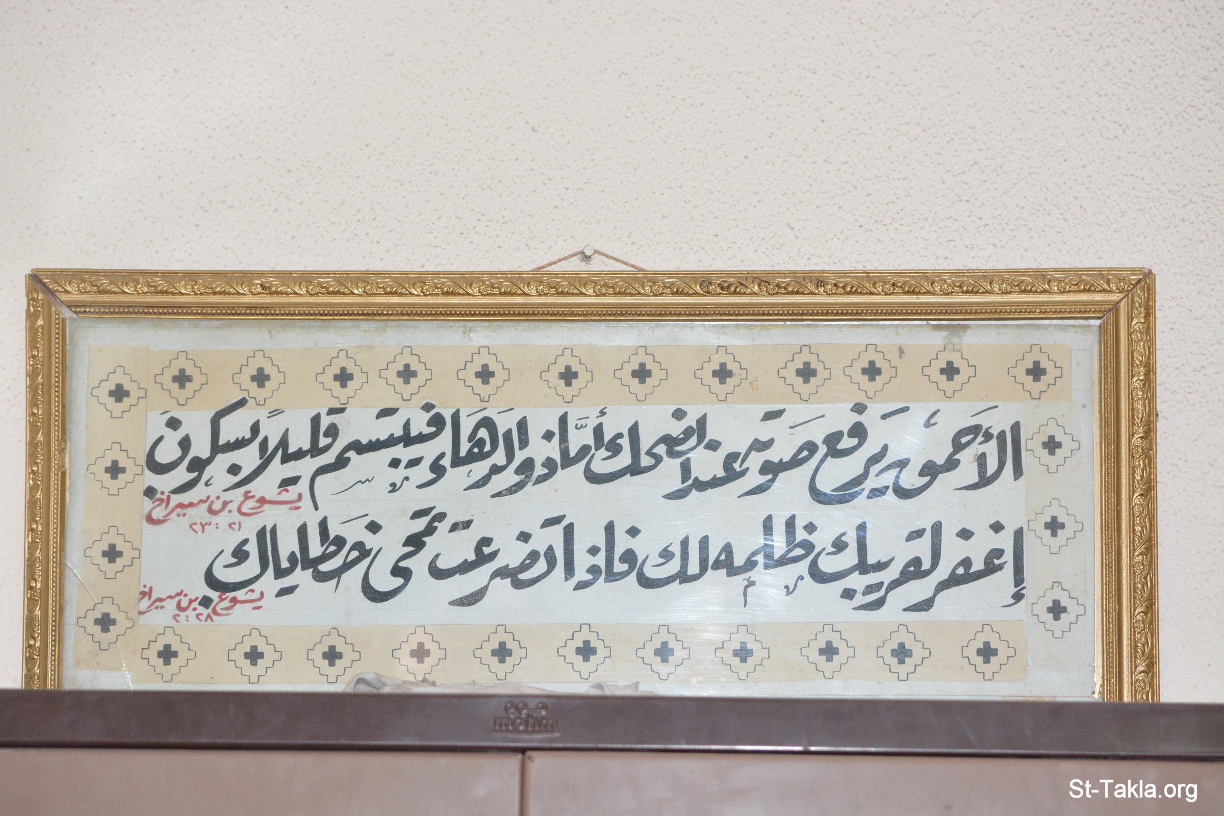 فن خط عربي: آيتان من سفر يشوع ابن سيراخ: "الأحمق يرفع صوته عند الضحك، أما ذو الدهاء فيتبسم قليلا بسكون." (سيراخ 21: 23) - "اغفر لقريبك ظلمه لك فإذا تضرعت تمحى خطاياك." (سيراخ 28: 2) - القاعة العليا بكنيسة الشهيدة دميانة القبطية الأرثوذكسية، الحضرة، الإسكندرية، مصر - (صورة 1) - تصوير مايكل غالي لموقع الأنبا تكلاهيمانوت - 23 يوليو 2022 م.