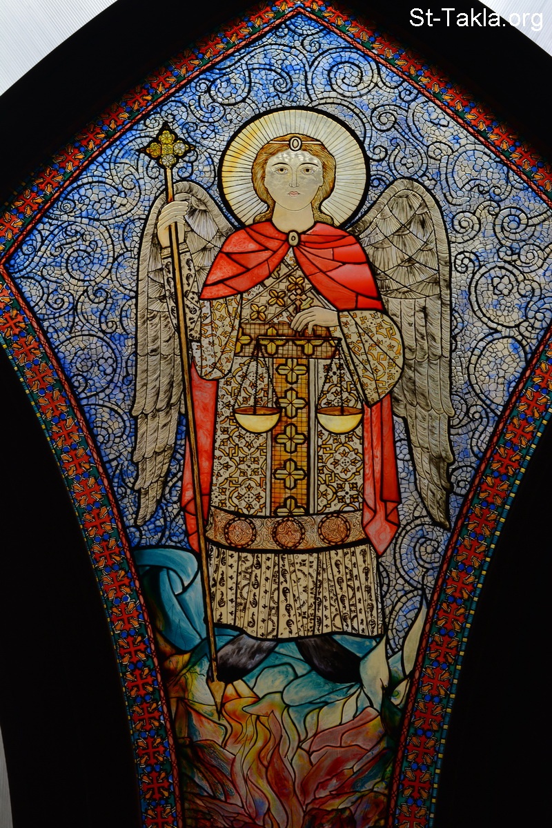 Archangel Michael, stained glass art (photo 3) - St. Michael Coptic Orthodox Church, Moustafa Kamel, Alexandria, Egypt - Photograph by Michael Ghaly for St-Takla.org, December 1, 2013.