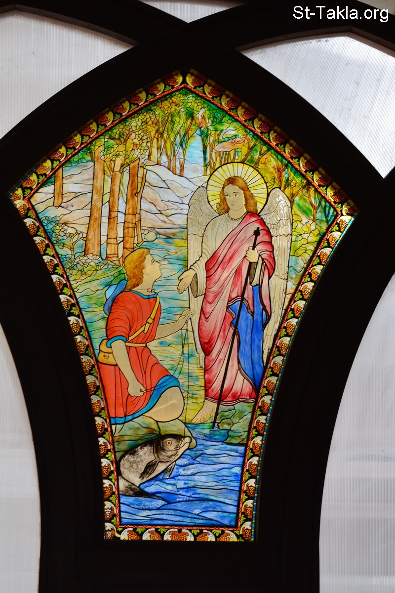 لوحة زجاج معشق تصور رئيس الملائكة الجليل رافائيل مع الشاب طوبيا - من صور كنيسة الملاك ميخائيل، مصطفى كامل، الإسكندرية، مصر - تصوير مايكل غالي لموقع الأنبا تكلاهيمانوت، 1 ديسمبر 2013 م.