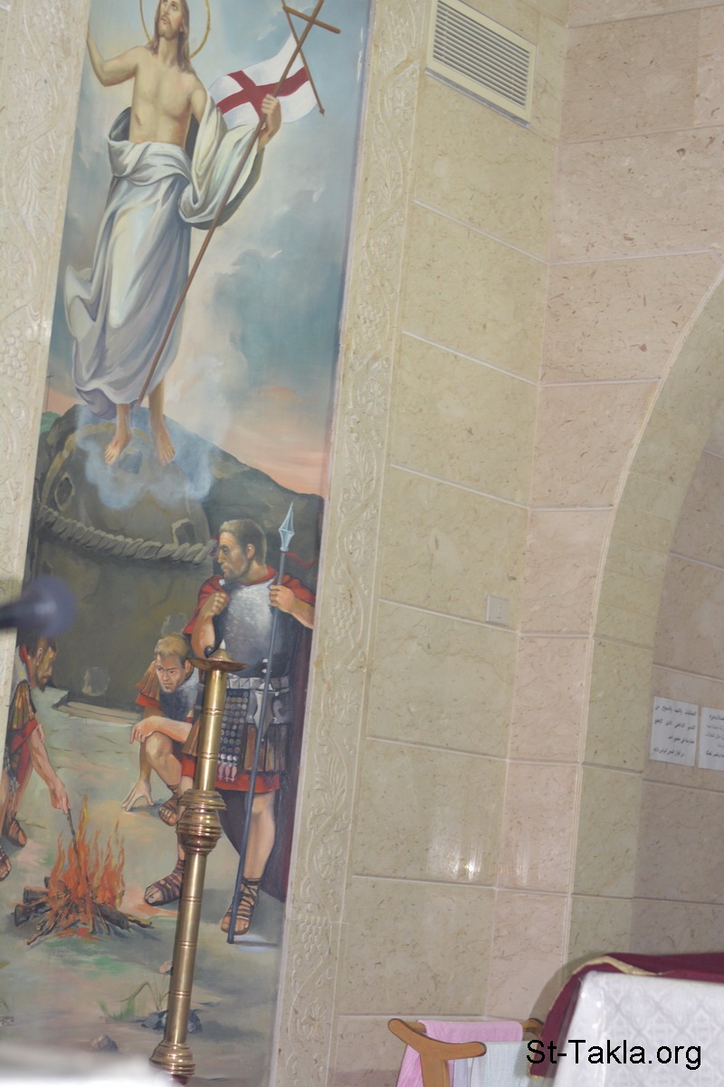 أيقونة قيامة السيد المسيح من بين الأموات والقبر مغلق (تفاصيل 2)، رسم الفنان سامي حنس - من صور كنيسة الملاك ميخائيل، مصطفى كامل، الإسكندرية، مصر - تصوير مايكل غالي لموقع الأنبا تكلاهيمانوت، 1 ديسمبر 2013 م.