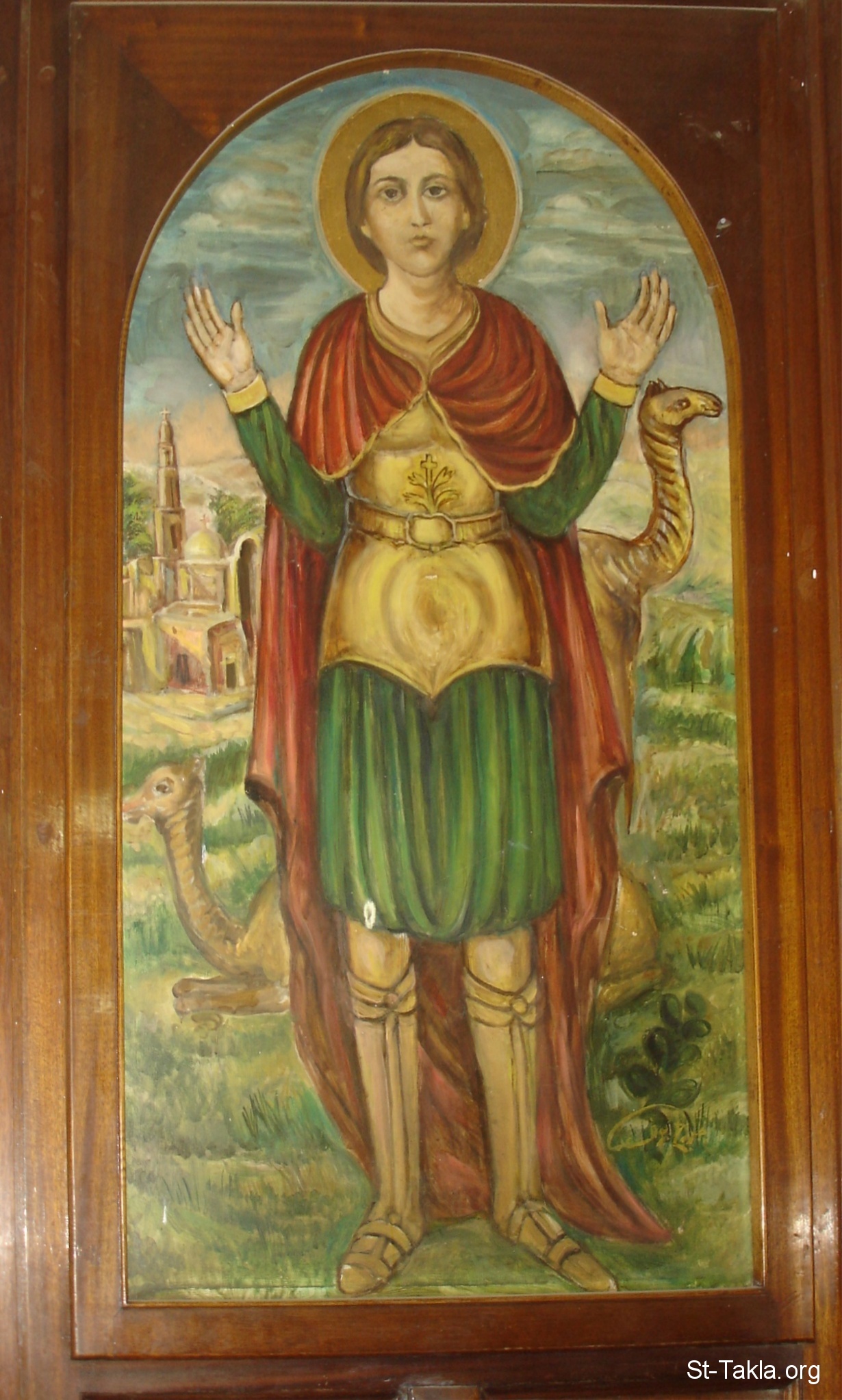 القديس مينا المصري، أيقونة قبطية رسم الفنان جورج أبو السعد - من صور كنيسة الشهيدة بربارة، الزاوية الحمراء، القاهرة، مصر - أكتوبر 2011 - تصوير مايكل غالي لـ: موقع الأنبا تكلا هيمانوت.