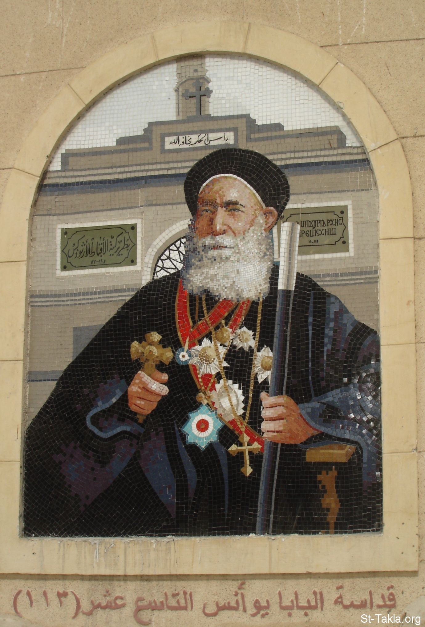 Mosaic fresco depicting His Holiness Pope Yoannis XIX (113) - from the entrance of the Old Cathedral, Asbakeya, Cairo, Egypt - October 2011 - Photograph by Michael Ghaly for St-Takla.org.