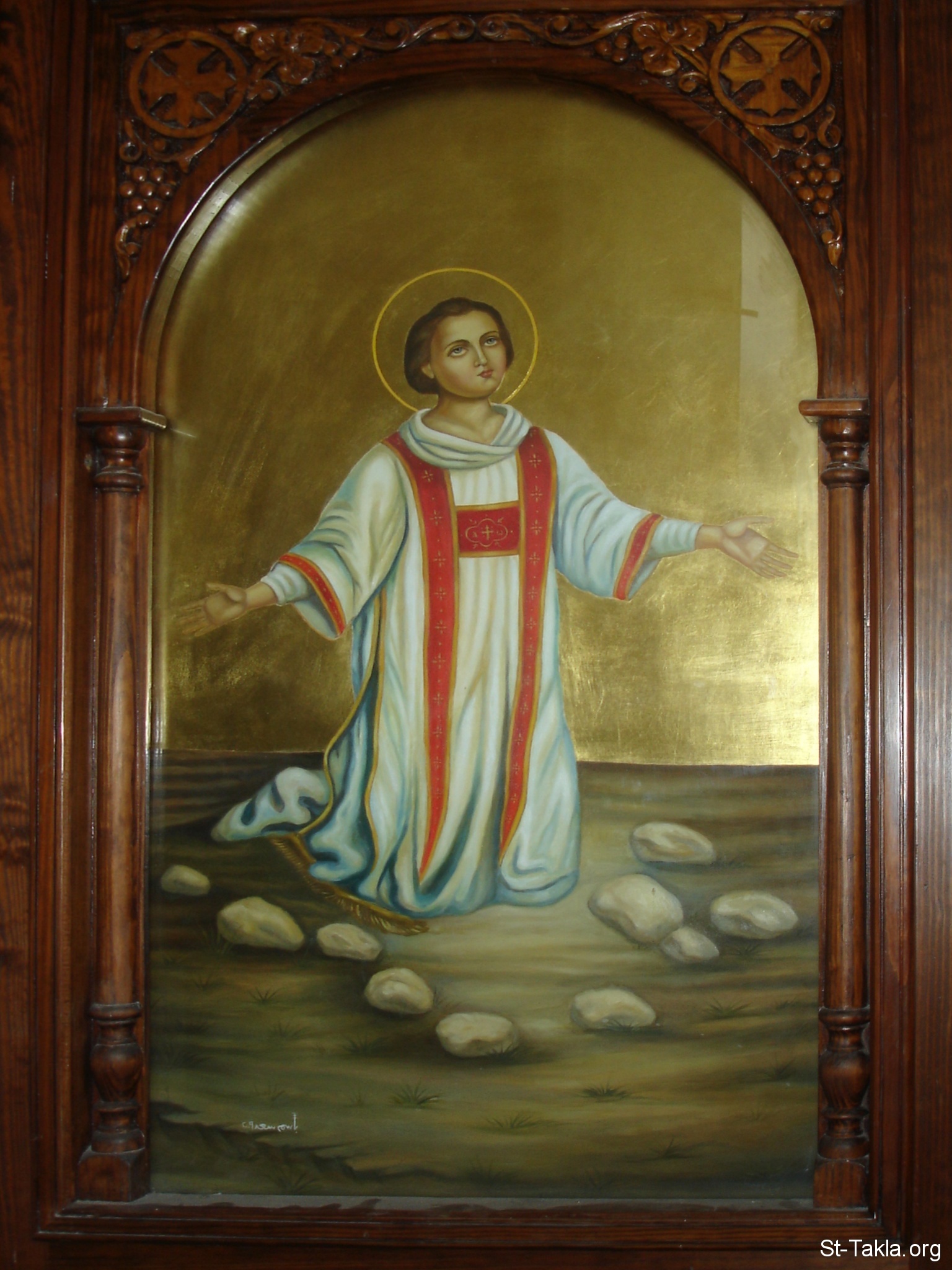 Coptic icon showing the stoning of Saint Stephen the first Deacon and Martyr, by Bassem Saad, 2009 - from Old Coptic Cathedral, other, Azbakya, Cairo, Egypt - October 2011 - Photograph by Michael Ghaly for St-Takla.org.