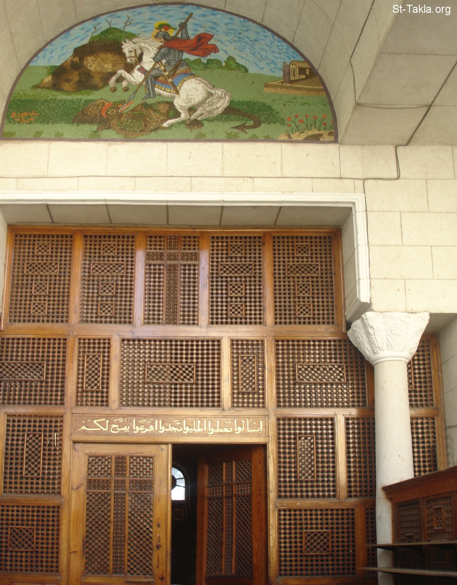 Entrance of the church with Saint Gerges mosaic (by: San George Group) - from St. George Church, Agouza, Giza , Egypt - October 2011 - Photograph by Michael Ghaly for St-Takla.org.