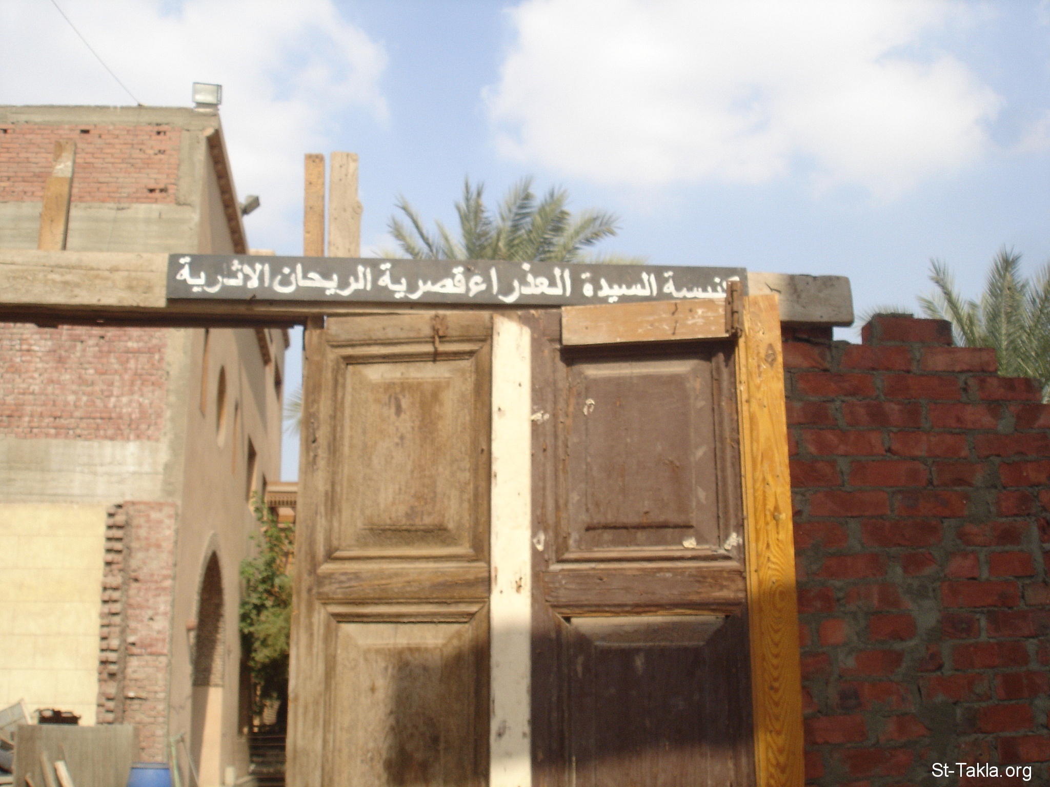 سور من الطوب الأحمر في مرحلة الترميم، وفوق الباب اسم الكنيسة - من صور كنيسة العذراء مريم، قصرية الريحان، القاهرة، مصر - أكتوبر 2011 - تصوير مايكل غالي لـ: موقع الأنبا تكلا هيمانوت.