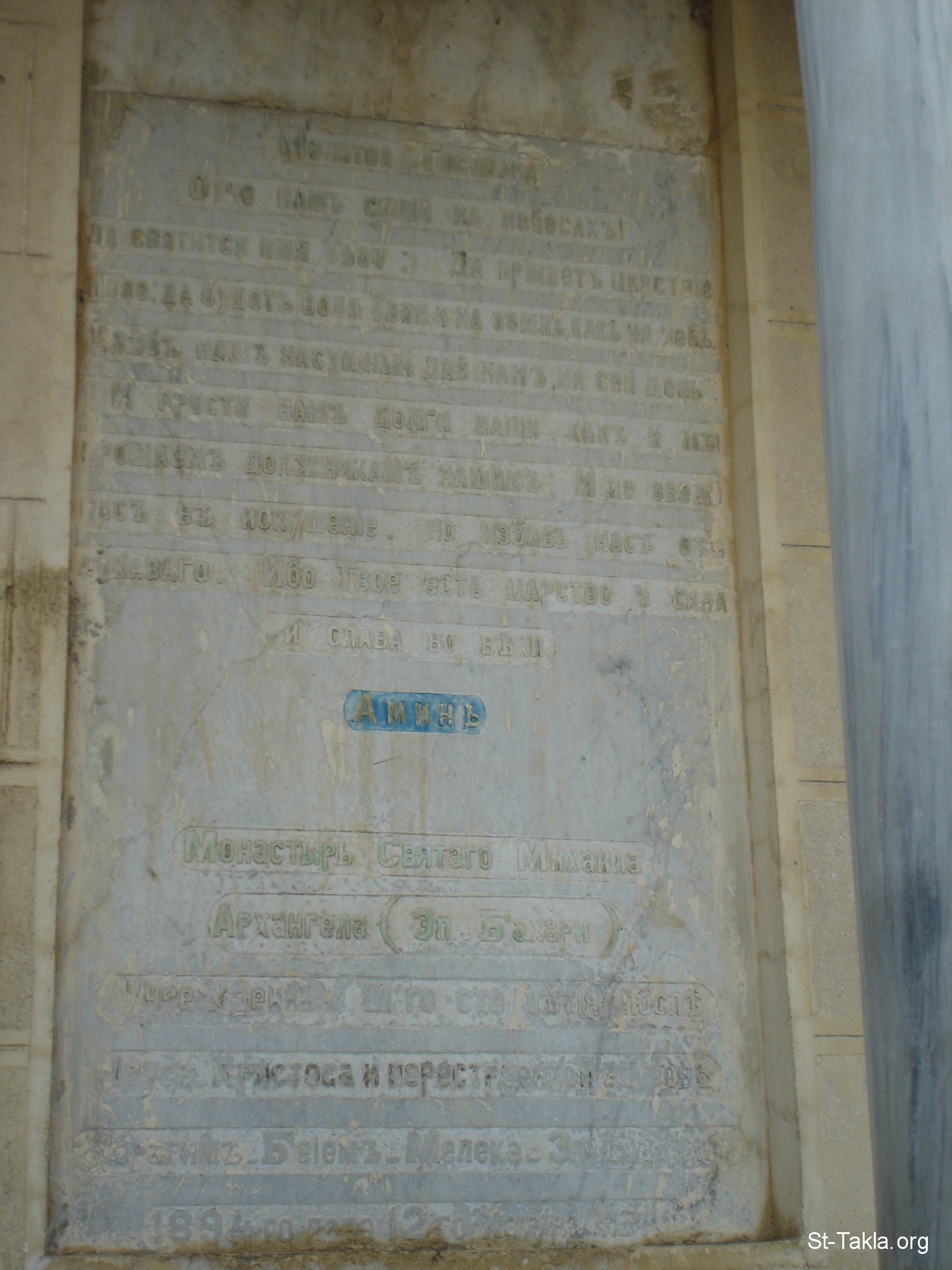 لوحة رخامية عليها الصلاة الربانية باللغة الروسية في الغالب، مع شاهد إنشاء الكنيسة في عهد البابا كيرلس الخامس سنة 1893 - من صور كنيسة الملاك ميخائيل، دير الملاك، القاهرة، مصر - أكتوبر 2011 - تصوير مايكل غالي لـ: موقع الأنبا تكلا هيمانوت.