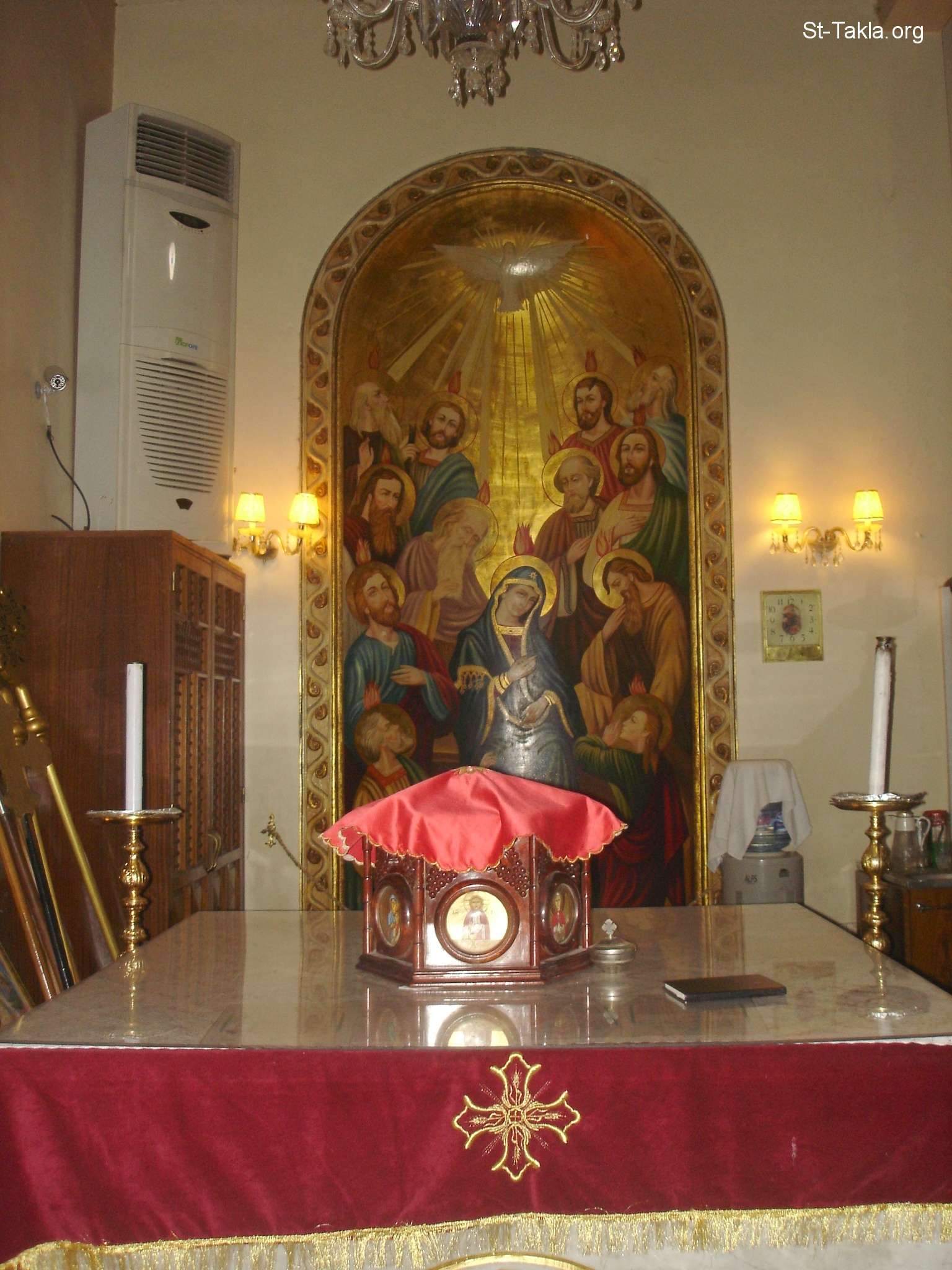 المذبح المقدس الجانبي مع لوحة جصية تصور يوم حلول الروح القدس - من صور كنيسة الملاك ميخائيل، الظاهر، القاهرة، مصر - أكتوبر 2011 - تصوير مايكل غالي لـ: موقع الأنبا تكلا هيمانوت.