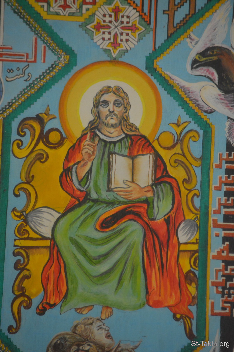 السيد يسوع المسيح الجالس على العرش: البانطوكراطور - تفاصيل من أيقونة أحداث سفر رؤيا يوحنا اللاهوتي، رسم الأب الراهب مكاريوس البرموسي، مضيفة دير البراموس، وادي النطرون، مصر - تصوير مايكل غالي لموقع الأنبا تكلاهيمانوت، 21 أكتوبر 2018 م.
