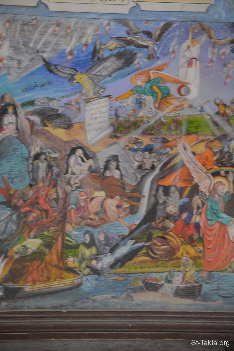 جهنم والنار الأبدية" "ثم متى تمت الألف السنة يحل الشيطان من سجنه، ويخرج ليضل الأمم الذين في أربع زوايا الأرض: جوج وماجوج، ليجمعهم للحرب، الذين عددهم مثل رمل البحر. فصعدوا على عرض الأرض، وأحاطوا بمعسكر القديسين وبالمدينة المحبوبة، فنزلت نار من عند الله من السماء وأكلتهم. وإبليس الذي كان يضلهم طرح في بحيرة النار والكبريت، حيث الوحش والنبي الكذاب. وسيعذبون نهارا وليلا إلى أبد الآبدين" (الرؤيا 20: 7-10) - تفاصيل (2) من أيقونة أحداث سفر رؤيا يوحنا اللاهوتي، رسم الأب الراهب مكاريوس البرموسي، مضيفة دير البراموس، وادي النطرون، مصر - تصوير مايكل غالي لموقع الأنبا تكلاهيمانوت، 21 أكتوبر 2018 م.