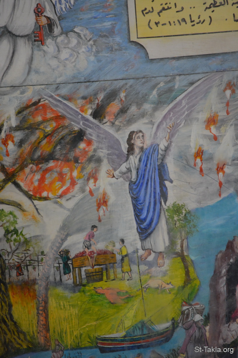"Then another angel came out of the temple which is in heaven, he also having a sharp sickle. And another angel came out from the altar, who had power over fire, and he cried with a loud cry to him who had the sharp sickle, saying, “Thrust in your sharp sickle and gather the clusters of the vine of the earth, for her grapes are fully ripe.” So the angel thrust his sickle into the earth and gathered the vine of the earth, and threw it into the great winepress of the wrath of God. And the winepress was trampled outside the city, and blood came out of the winepress, up to the horses’ bridles, for one thousand six hundred furlongs" (Revelation 14: 17-20) - Details (2) from the icon of the events of the Apocalypse (Book of Revelation), by Father Makarious Al-Baramousy, Baramous Monastery, Natroun Valley, Egypt - Photograph by Michael Ghaly for St-Takla.org, October 21, 2018.