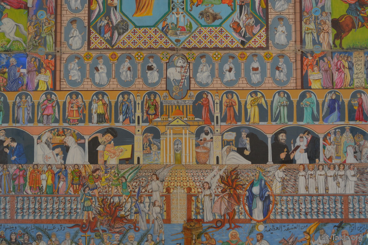جانب من الصورة به: بعض الكهنة الأربعة والعشرون - رؤساء الملائكة السبعة - السبعة أرواح أمام عرش الله - أسرار الكنيسة السبعة - المرأة المتمخضة - الوحشي والنبي الكذاب - ملائكة الجامات السبعة - تفاصيل من أيقونة أحداث سفر رؤيا يوحنا اللاهوتي، رسم الأب الراهب مكاريوس البرموسي، مضيفة دير البراموس، وادي النطرون، مصر - تصوير مايكل غالي لموقع الأنبا تكلاهيمانوت، 21 أكتوبر 2018 م.