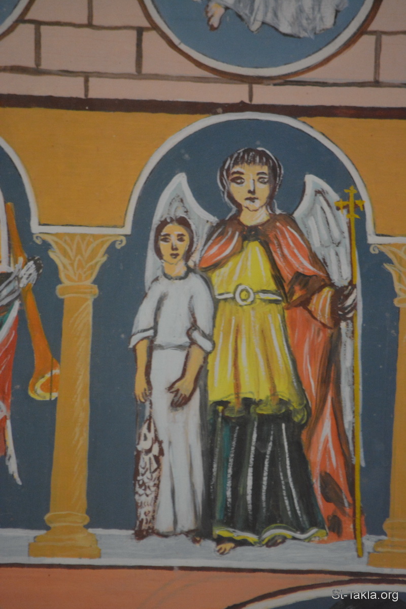 رئيس الملائكة الجليل رافائيل (روفائيل) مع طوبيا الابن - تفاصيل من أيقونة أحداث سفر رؤيا يوحنا اللاهوتي، رسم الأب الراهب مكاريوس البرموسي، مضيفة دير البراموس، وادي النطرون، مصر - تصوير مايكل غالي لموقع الأنبا تكلاهيمانوت، 21 أكتوبر 2018 م.