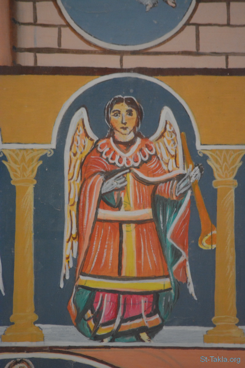 رئيس الملائكة الجليل سورئيل (سورييل – سوريال) - تفاصيل من أيقونة أحداث سفر رؤيا يوحنا اللاهوتي، رسم الأب الراهب مكاريوس البرموسي، مضيفة دير البراموس، وادي النطرون، مصر - تصوير مايكل غالي لموقع الأنبا تكلاهيمانوت، 21 أكتوبر 2018 م.