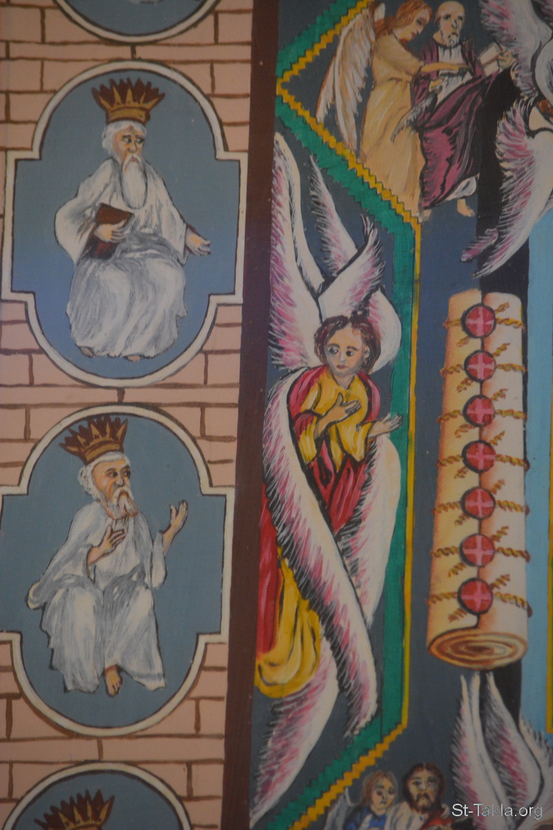 واحد من السارافيم ذوي الستة أجنحة، بجانبه سفر الختوم السبعة "ورأيت على يمين الجالس على العرش سفرا مكتوبا من داخل ومن وراء، مختوما بسبعة ختوم. ورأيت ملاكا قويا ينادي بصوت عظيم: «من هو مستحق أن يفتح السفر ويفك ختومه؟» فلم يستطع أحد في السماء ولا على الأرض ولا تحت الأرض أن يفتح السفر ولا أن ينظر إليه" (الرؤيا 5: 1-3) - تفاصيل (26) من أيقونة أحداث سفر رؤيا يوحنا اللاهوتي، رسم الأب الراهب مكاريوس البرموسي، مضيفة دير البراموس، وادي النطرون، مصر - تصوير مايكل غالي لموقع الأنبا تكلاهيمانوت، 21 أكتوبر 2018 م.