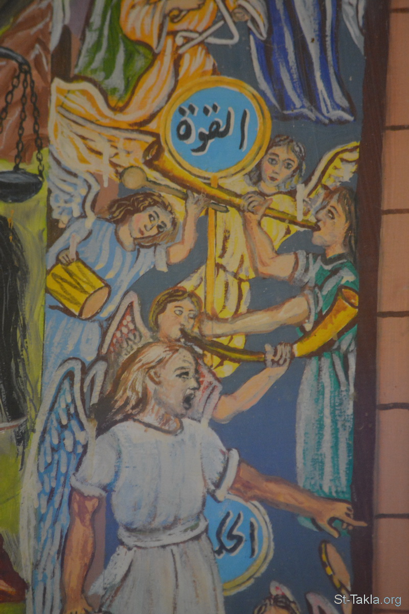 القوة: "ونظرت وسمعت صوت ملائكة كثيرين حول العرش والحيوانات والشيوخ، وكان عددهم ربوات ربوات وألوف ألوف، قائلين بصوت عظيم: «مستحق هو الخروف المذبوح أن يأخذ القدرة والغنى والحكمة والقوة والكرامة والمجد والبركة!»" (الرؤيا 5: 11-12) - تفاصيل من أيقونة أحداث سفر رؤيا يوحنا اللاهوتي، رسم الأب الراهب مكاريوس البرموسي، مضيفة دير البراموس، وادي النطرون، مصر - تصوير مايكل غالي لموقع الأنبا تكلاهيمانوت، 21 أكتوبر 2018 م.
