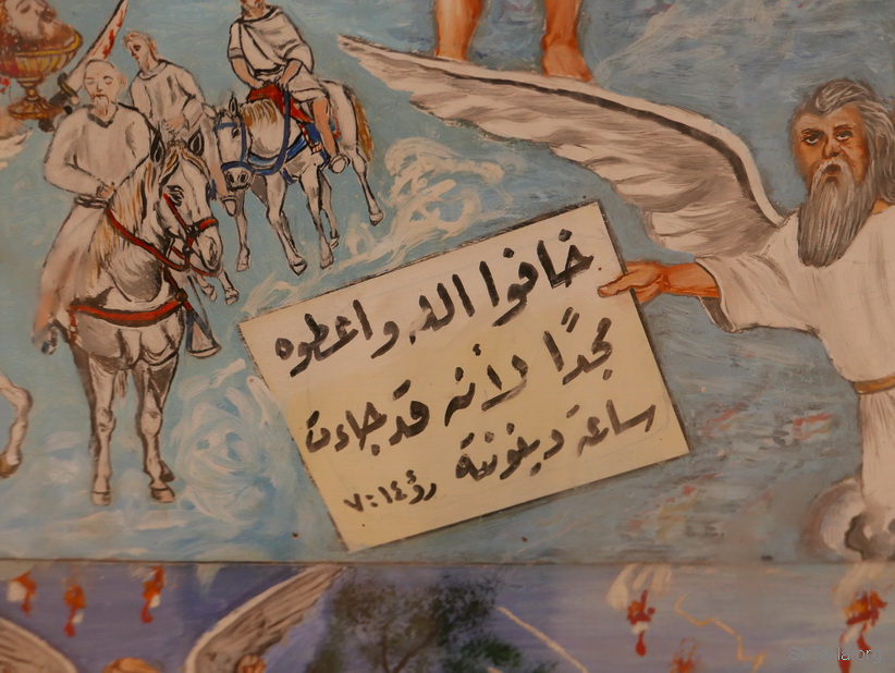 "خافوا الله وأعطوه مجدا، لأنه قد جاءت ساعة دينونته" (الرؤيا 14: 7) - تفاصيل من أيقونة أحداث سفر رؤيا يوحنا اللاهوتي، رسم الأب الراهب مكاريوس البرموسي، مضيفة دير البراموس، وادي النطرون، مصر - تصوير مايكل غالي لموقع الأنبا تكلاهيمانوت، 21 أكتوبر 2018 م.
