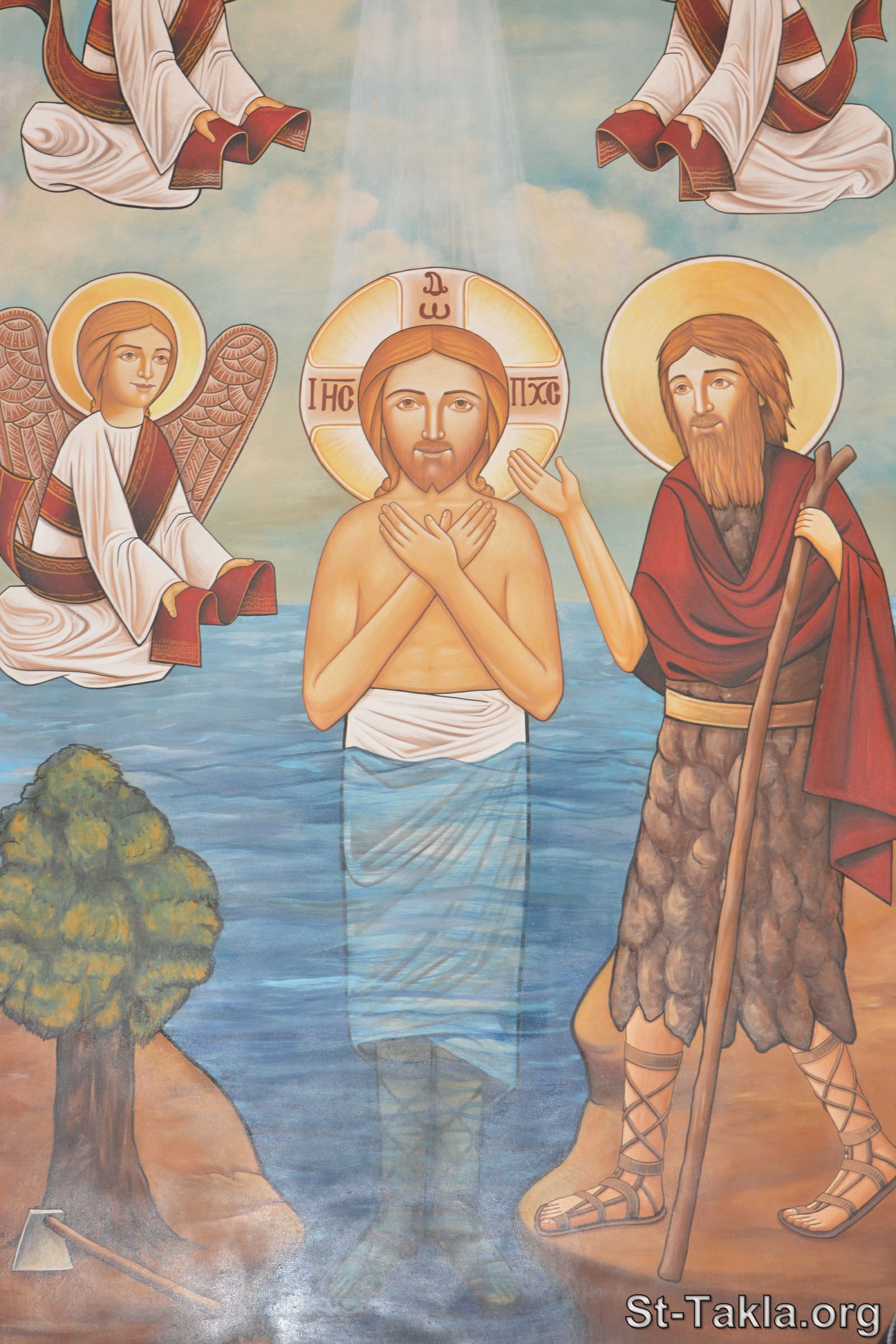 معمودية السيد المسيح يواسطة القديس يوحنا المعمدان، فن قبطي من رسم أبونا الراهب القمص بولس الأنبا بيشوي - تعميد أطفال صغار في المعمودية (صورة 18) - دير الأنبا بيشوي (صورة 18)، وادي النطرون، مصر - تصوير مايكل غالي لـ: موقع الأنبا تكلا هيمانوت، 17 مارس 2024 م.