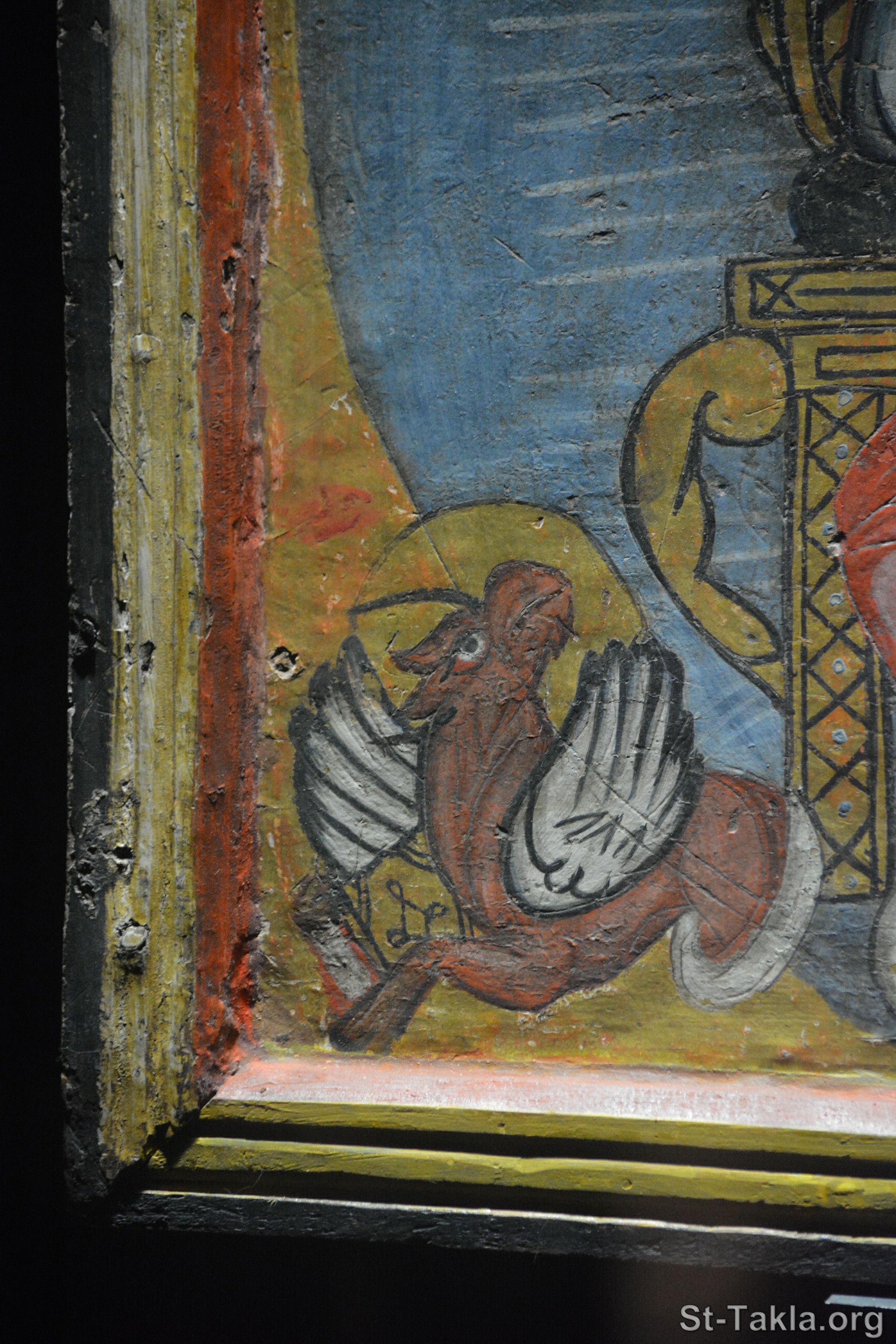 Christ is sitting on a throne (details 3), blessing with His right hand, and holding an open Gospel in the other. He is surrounded by winged creatures representing the four evangelists. - 18th century - attributed to Ibrahim al-Nassikh - from the Church of the Virgin al-Damshiria, Old Cairo, Egypt. - The Coptic Museum (image 1744), Cairo, Egypt - Photograph by Michael Ghaly for St-Takla.org, 20 November 2023.