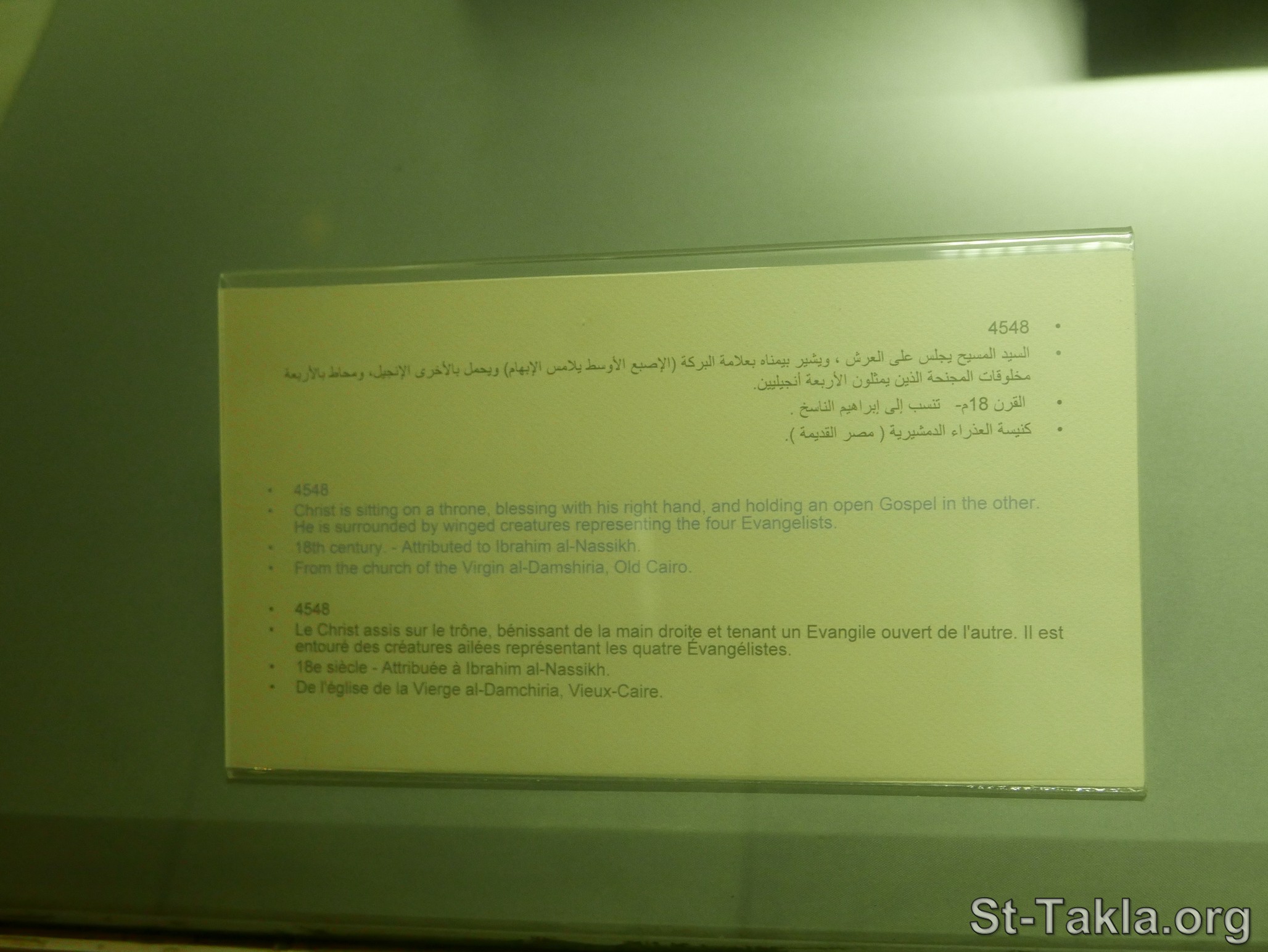 السيد المسيح يجلس على العرش (بطاقة)، ويشير بيمناه بعلامة البركة (الإصبع الأوسط يلامس الإبهام) ويحمل بالأخرى الإنجيل، ومُحاط بالأربعة مخلوقات المجنحة الذين يمثلون الأربعة إنجيليين - القرن 18 - تُنسب إلى إبراهيم الناسخ - كنيسة العذراء الدمشيرية ( مصر القديمة)، القاهرة، مصر. - المتحف القبطي (صورة 1747)، القاهرة، مصر - تصوير مايكل غالي لـ: موقع الأنبا تكلا هيمانوت، 20 نوفمبر 2023 م.
