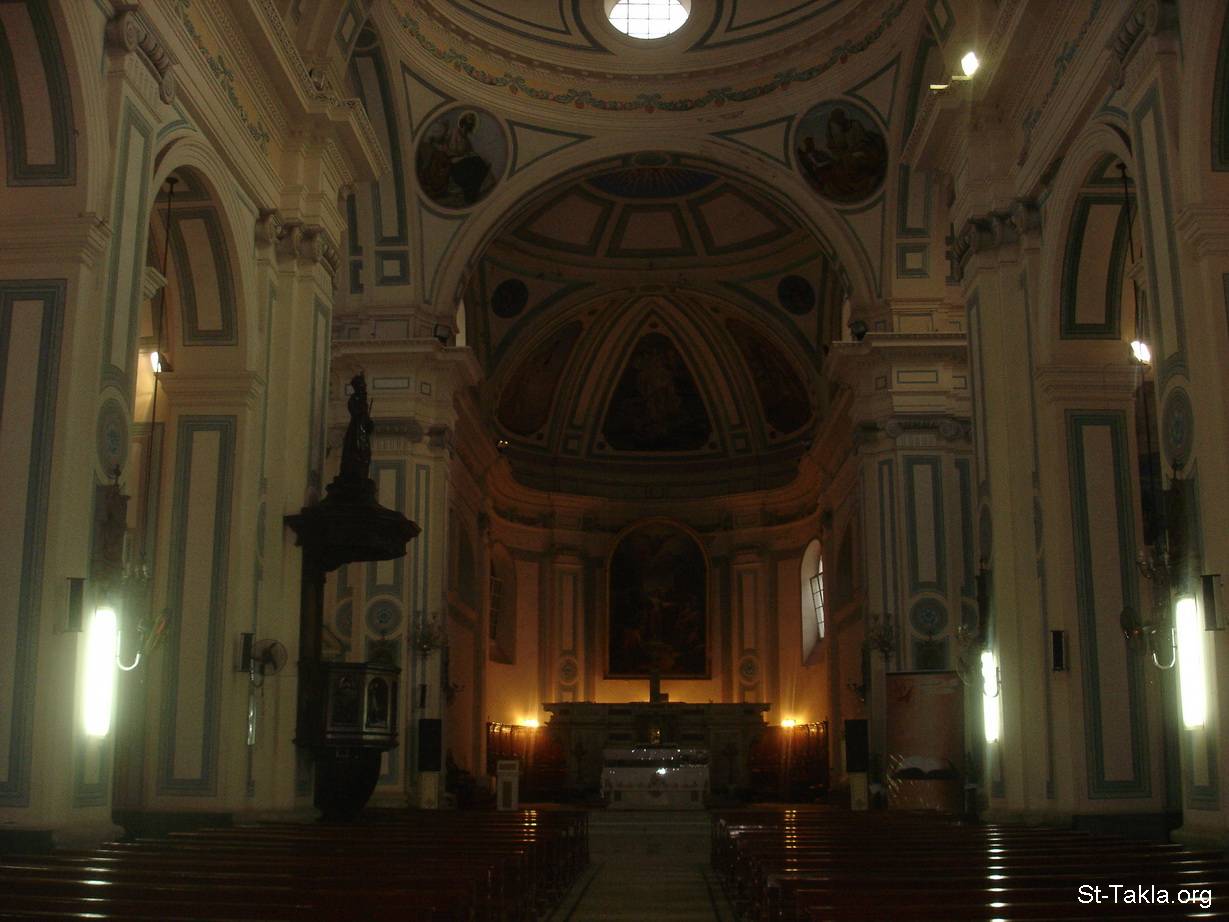 منظر عام للكنيسة من الداخل - كاتدرائية سانت كاترين الكاثوليكية، المنشية، الإسكندرية، مصر. تأسست عام 1850 م. - تصوير مايكل غالي لـ: موقع الأنبا تكلا هيمانوت، 24 يناير 2013 و3 نوفمبر 2015 م.