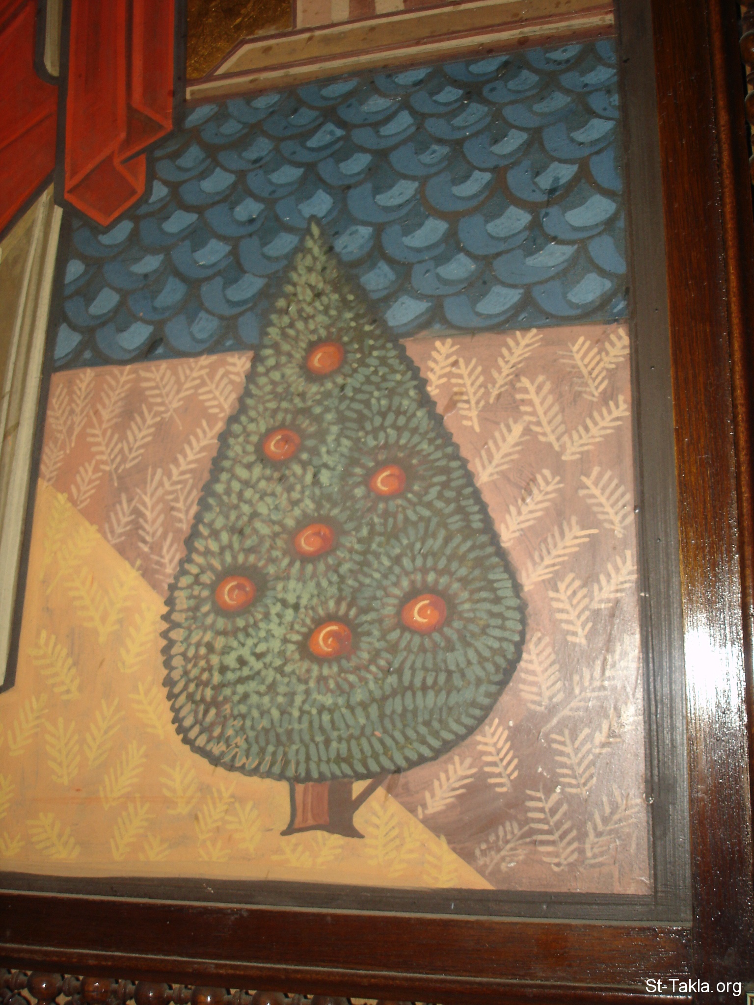 شجرة مثمرة بها سبعة ثمار تمثل أسرار الكنيسة السبعة - تفاصيل من أيقونة قبطية تصور القديس مارمرقس الرسول والإنجيلي، ناظر الإله، رسم الفنان إيزاك فانوس، 1991 (تفاصيل 1) - من صور كاتدرائية كل القديسين، الزمالك (بجانب ماريوت)، القاهرة، مصر - أكتوبر 2011 م. - تصوير مايكل غالي لـ: موقع الأنبا تكلا هيمانوت.