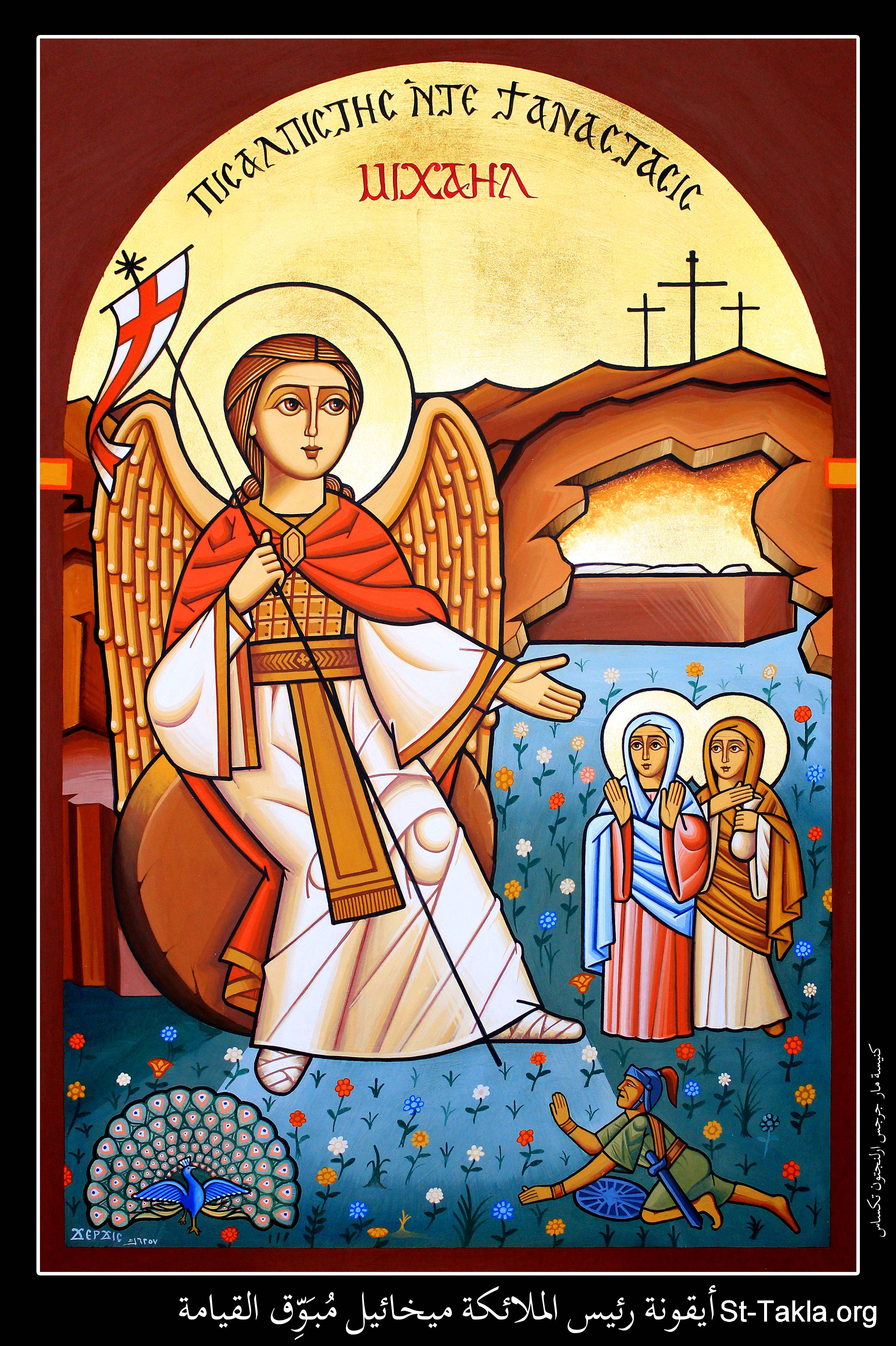 أيقونة رئيس الملائكة ميخائيل مبوق القيامة، كنيسة مارجرجس، أرلنجتون، تكساس، الولايات المتحدة الأمريكية، 1732 ش. (2015-2016 م. - والذي يوافق سنة 6257 حسب التقويم المصري القديم)، فن قبطي، موضوعة بإذن - رسم الفنان جرجس سمير: كاتب الأيقونة الأرثوذكسية