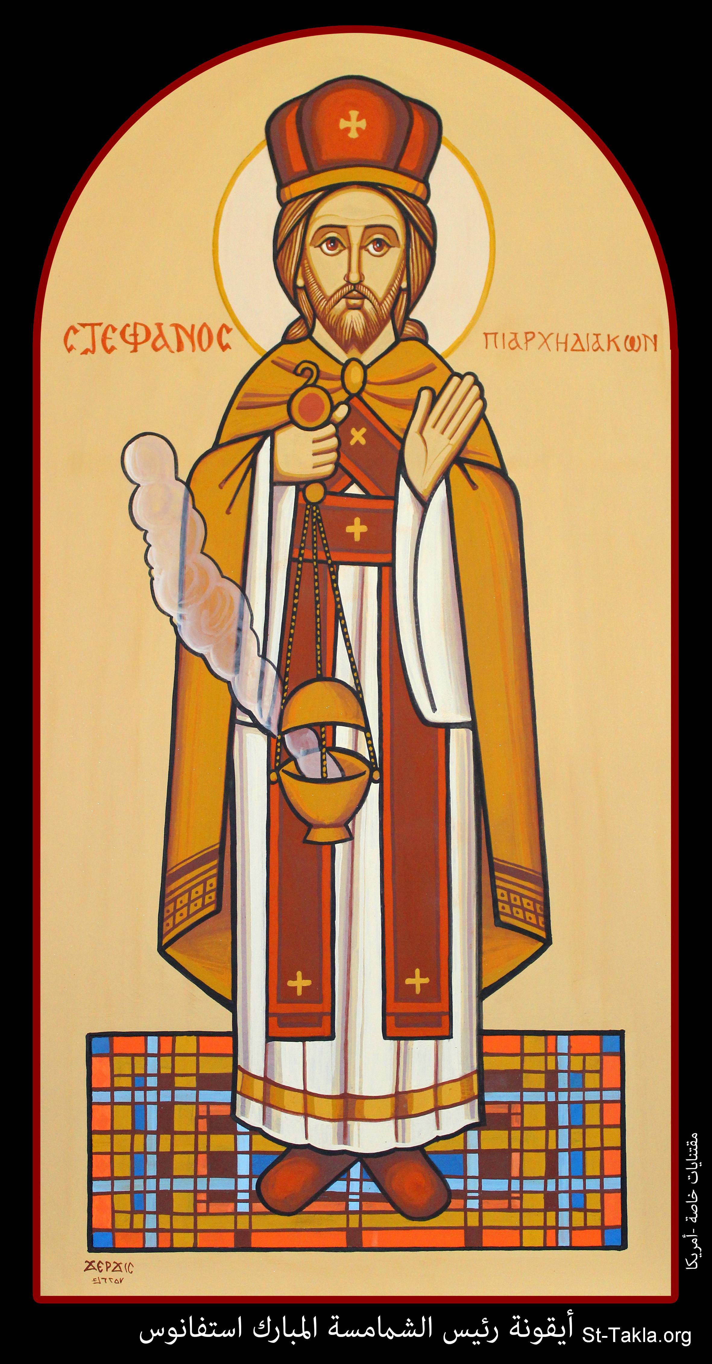 أيقونة رئيس الشمامسة المبارك استفانوس، مقتنيات خاصة، أمريكا، 1732 ش. (2015-2016 م. - والذي يوافق سنة 6257 حسب التقويم المصري القديم)، فن قبطي، موضوعة بإذن - رسم الفنان جرجس سمير: كاتب الأيقونة الأرثوذكسية