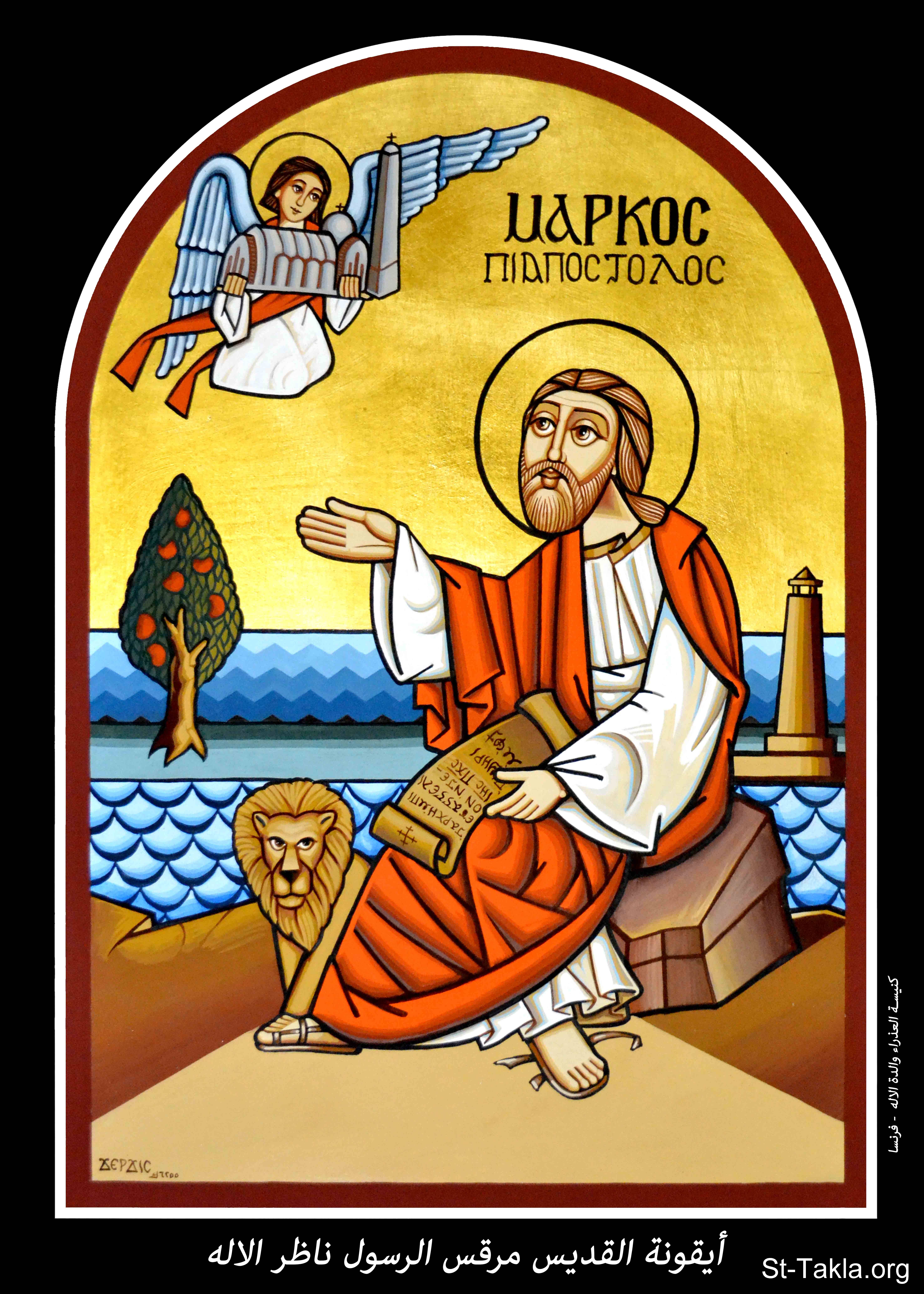 أيقونة القديس مرقس الرسول ناظر الإله، كنيسة العذراء والدة الإله، فرنسا، 1730 ش. (2013-2014 م. - والذي يوافق سنة 6255 حسب التقويم المصري القديم)، فن قبطي، موضوعة بإذن - رسم الفنان جرجس سمير: كاتب الأيقونة الأرثوذكسية