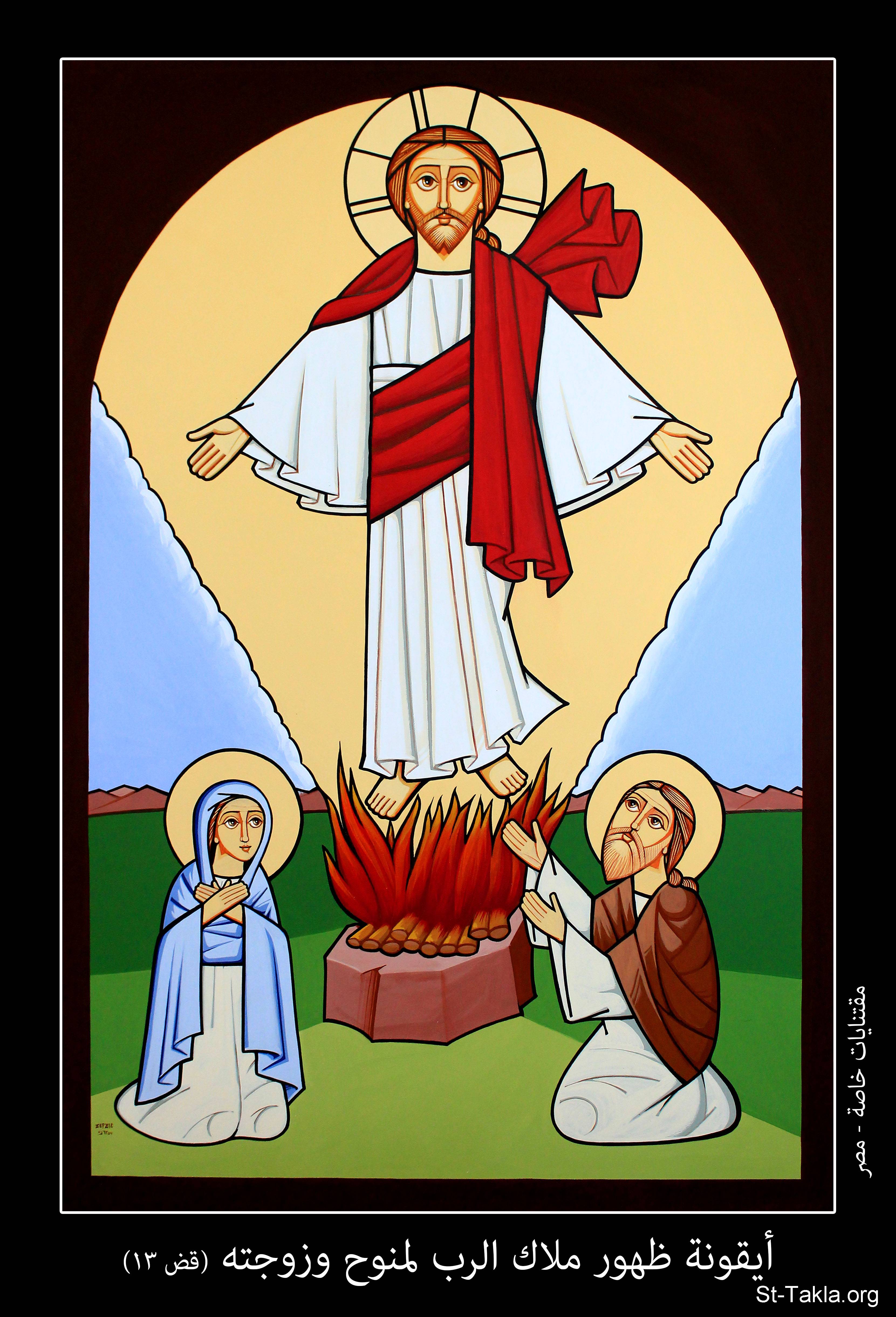 أيقونة ظهور ملاك الرب لمنوح وزوجته (القضاة 13)، مقتنيات خاصة، مصر، 1732 ش. (2015-2016 م. - والذي يوافق سنة 6257 حسب التقويم المصري القديم)، فن قبطي، موضوعة بإذن - رسم الفنان جرجس سمير: كاتب الأيقونة الأرثوذكسية.