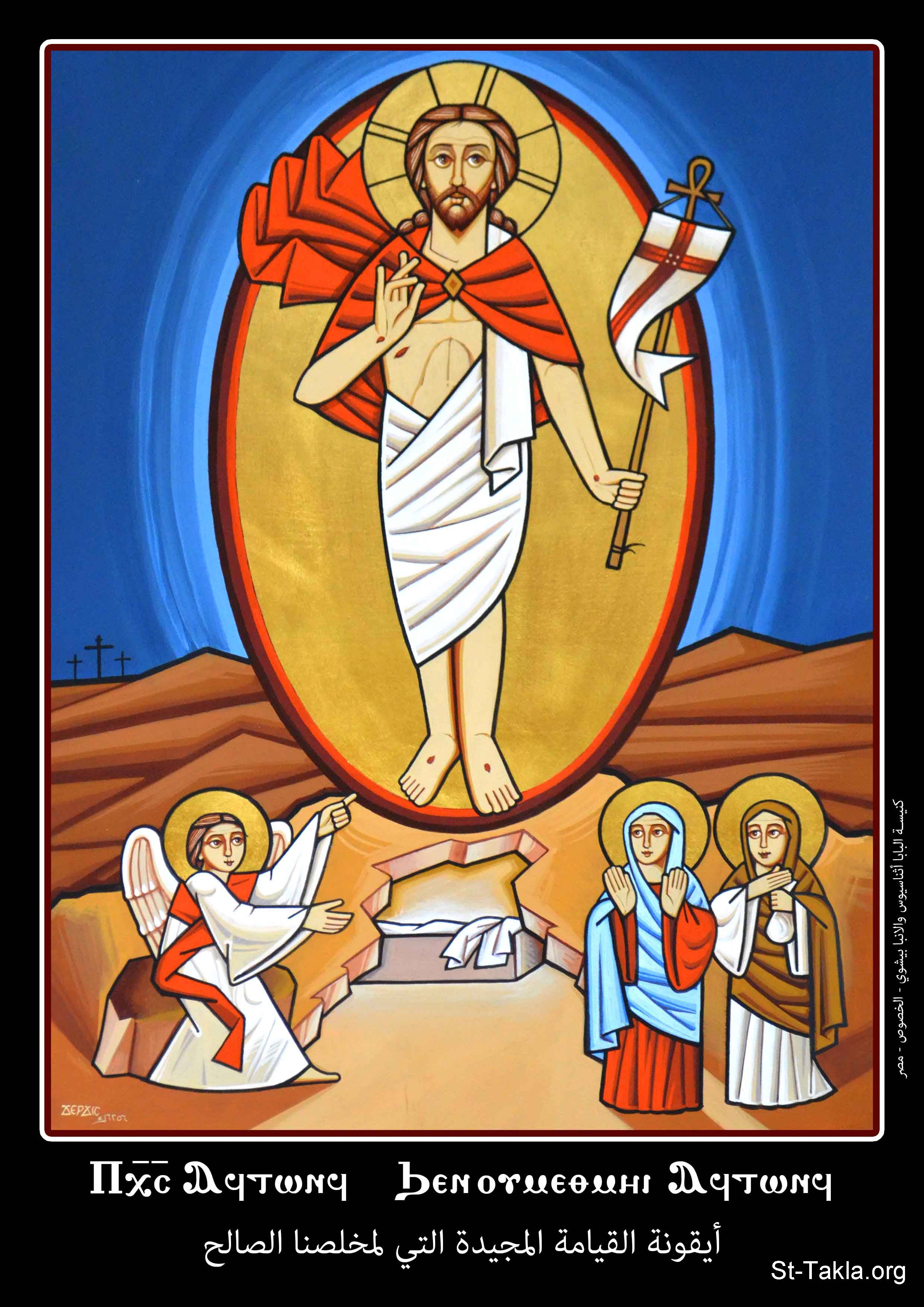أيقونة القيامة المجيدة التي لمخلصنا الصالح، كنيسة البابا أثناسيوس والأنبا بيشوي، الخصوص، مصر، 1731 ش. (2014-2015 م. - والذي يوافق سنة 6256 حسب التقويم المصري القديم)، فن قبطي، موضوعة بإذن - رسم الفنان جرجس سمير: كاتب الأيقونة الأرثوذكسية