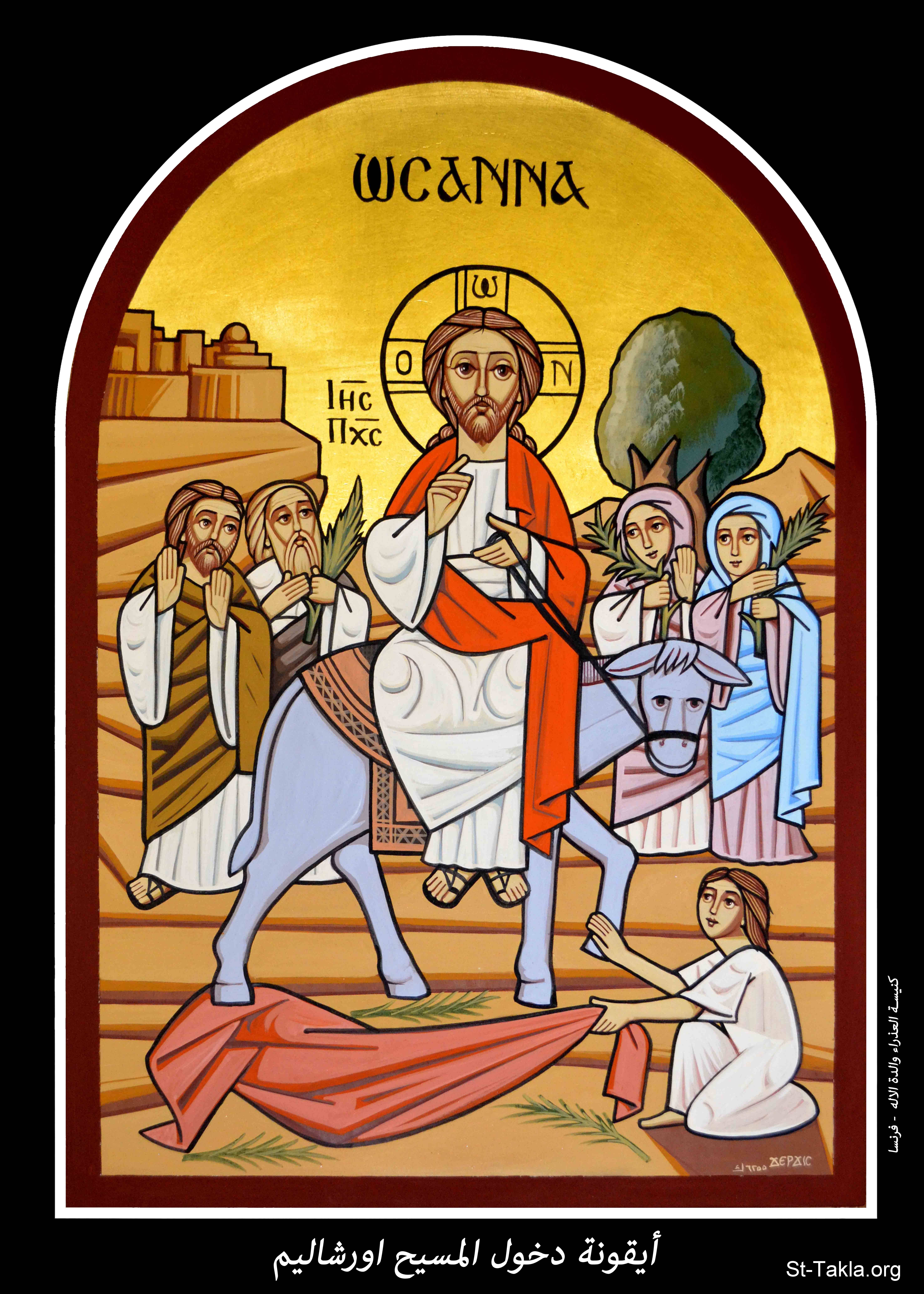 أيقونة دخول المسيح أورشليم، كنيسة العذراء والدة الإله، فرنسا، 1730 ش. (2013-2014 م. - والذي يوافق سنة 6255 حسب التقويم المصري القديم)، فن قبطي، موضوعة بإذن - رسم الفنان جرجس سمير: كاتب الأيقونة الأرثوذكسية