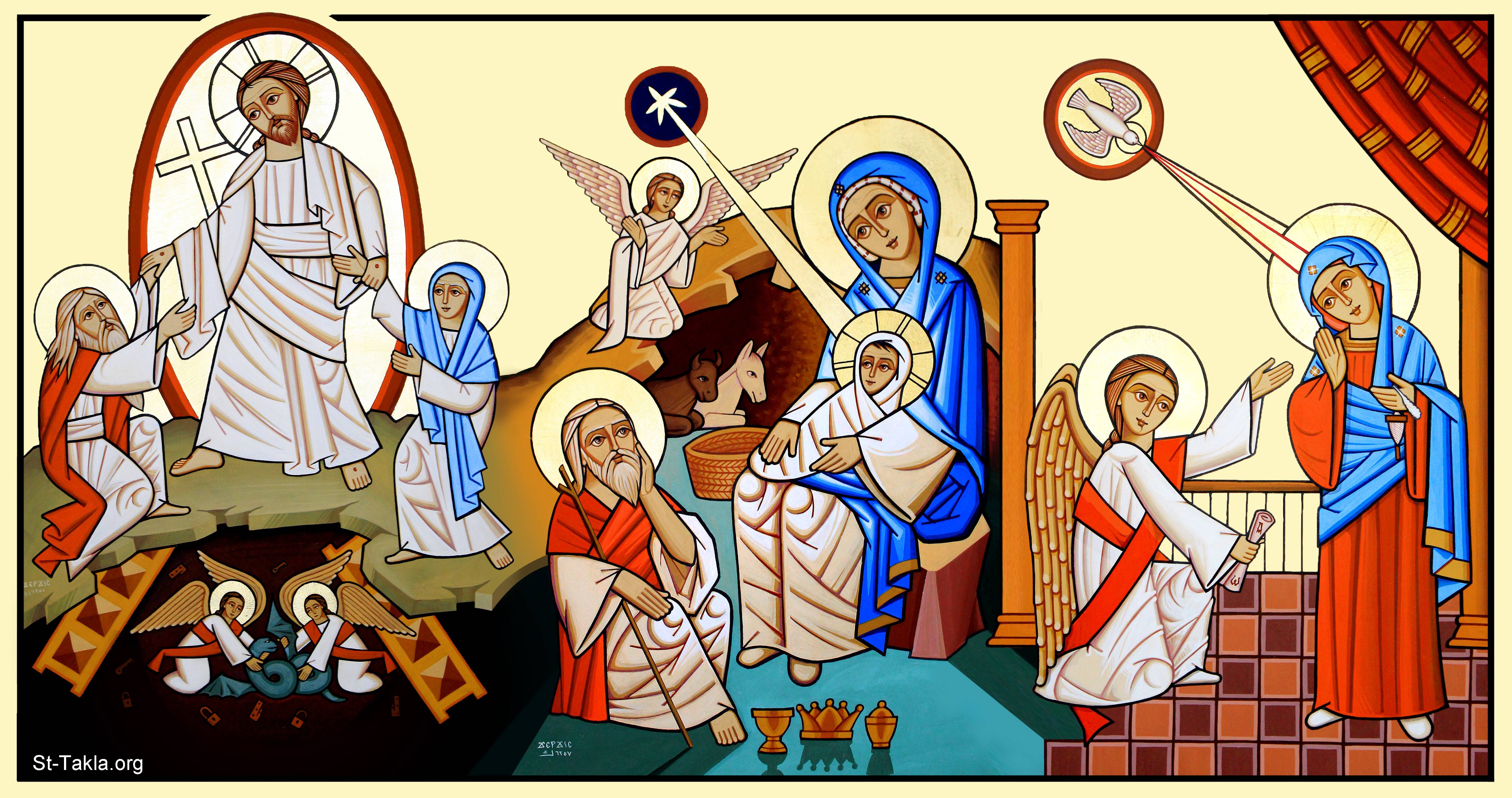 أيقونة البشارة والميلاد والقيامة (مجمعة)، كنيسة مارجرجس، أرلنجتون، تكساس، الولايات المتحدة الأمريكية، 1732 ش. (2015-2016 م. - والذي يوافق سنة 6257 حسب التقويم المصري القديم)، فن قبطي، موضوعة بإذن - رسم الفنان جرجس سمير: كاتب الأيقونة الأرثوذكسية