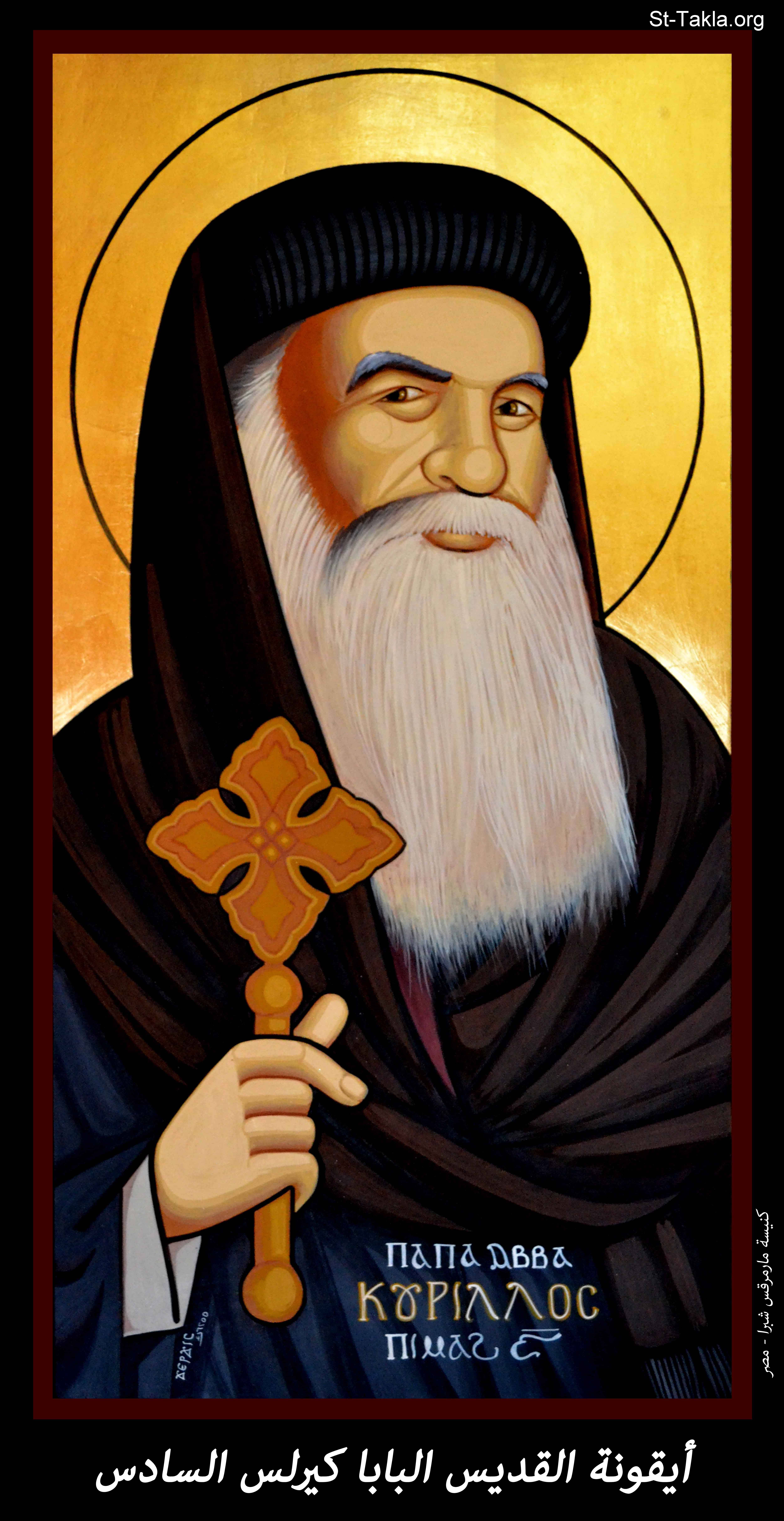 أيقونة القديس البابا كيرلس السادس، كنيسة مارمرقس، شبرا، القاهرة، مصر، 1730 ش. (2013-2014 م. - والذي يوافق سنة 6255 حسب التقويم المصري القديم)، فن قبطي، موضوعة بإذن - رسم الفنان جرجس سمير: كاتب الأيقونة الأرثوذكسية