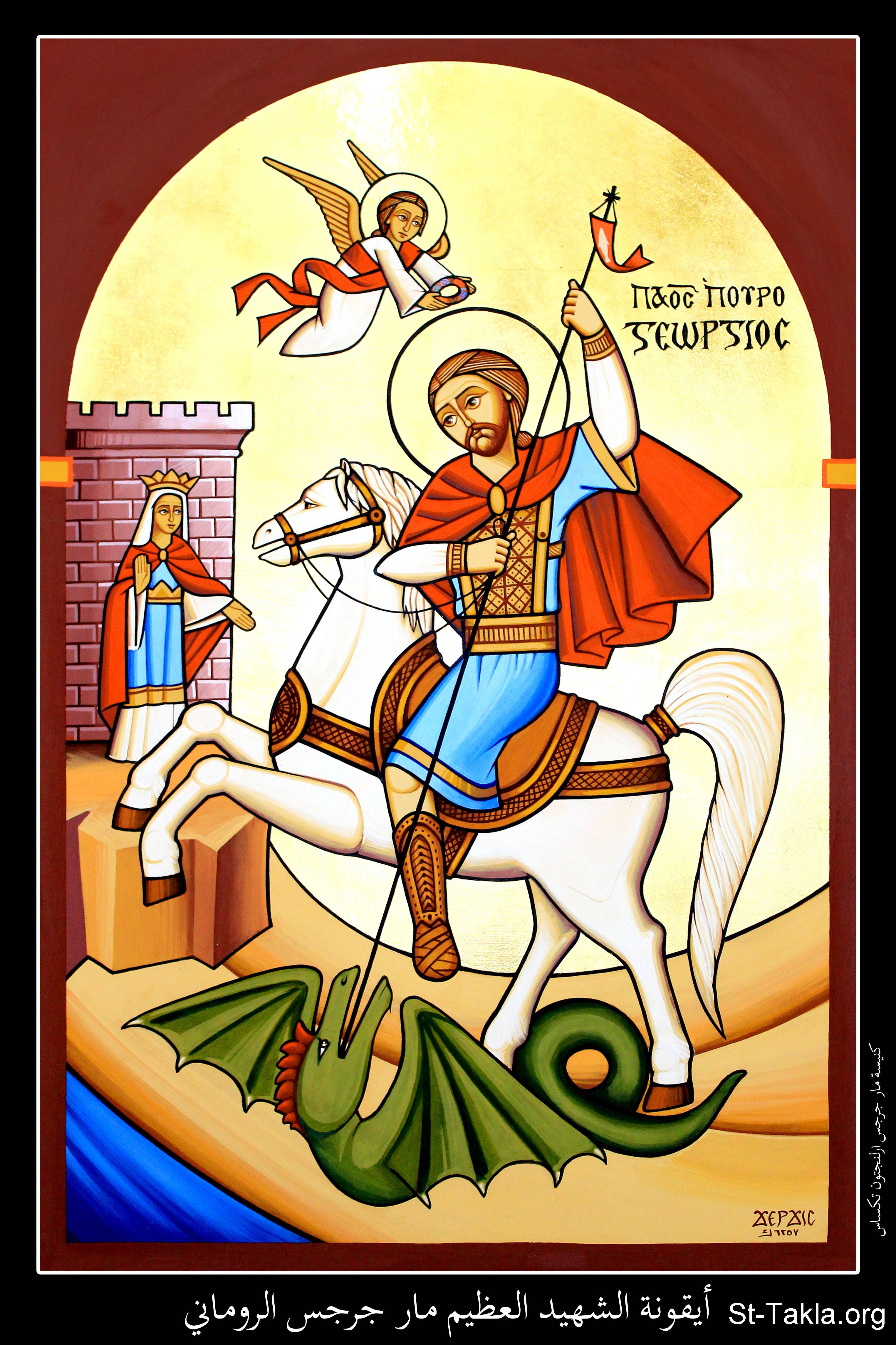 أيقونة الشهيد مارجرجس الروماني، كنيسة مارجرجس، أرلنجتون، تكساس، الولايات المتحدة الأمريكية، 1732 ش. (2015-2016 م. - والذي يوافق سنة 6257 حسب التقويم المصري القديم)، فن قبطي، موضوعة بإذن - رسم الفنان جرجس سمير: كاتب الأيقونة الأرثوذكسية