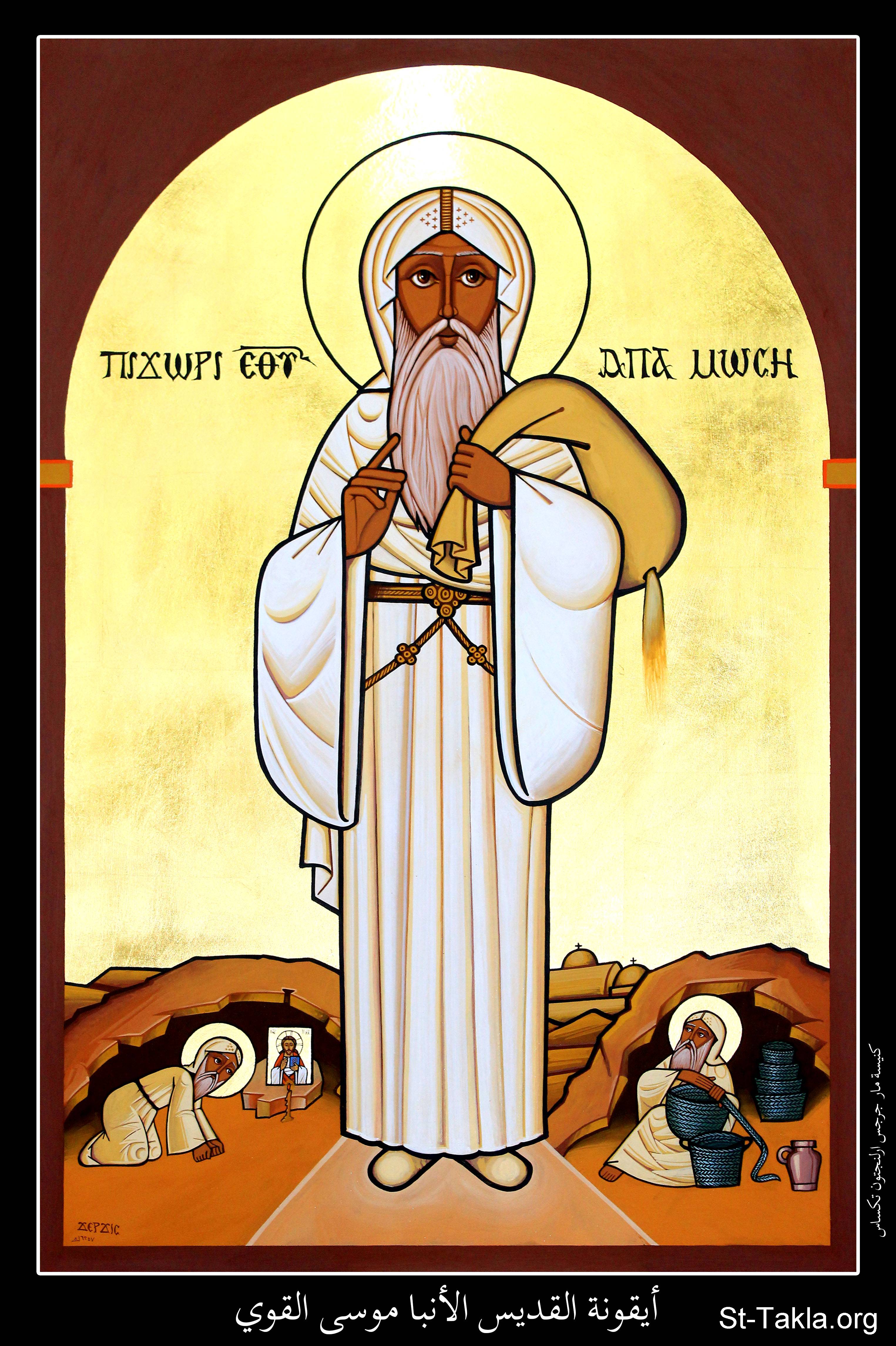 أيقونة القديس القوي الأنبا موسى الأسود، مع أحداث من حياته، كنيسة مارجرجس، أرلنجتون، تكساس، الولايات المتحدة الأمريكية، 1732 ش. (2015-2016 م. - والذي يوافق سنة 6257 حسب التقويم المصري القديم)، فن قبطي، موضوعة بإذن - رسم الفنان جرجس سمير: كاتب الأيقونة الأرثوذكسية