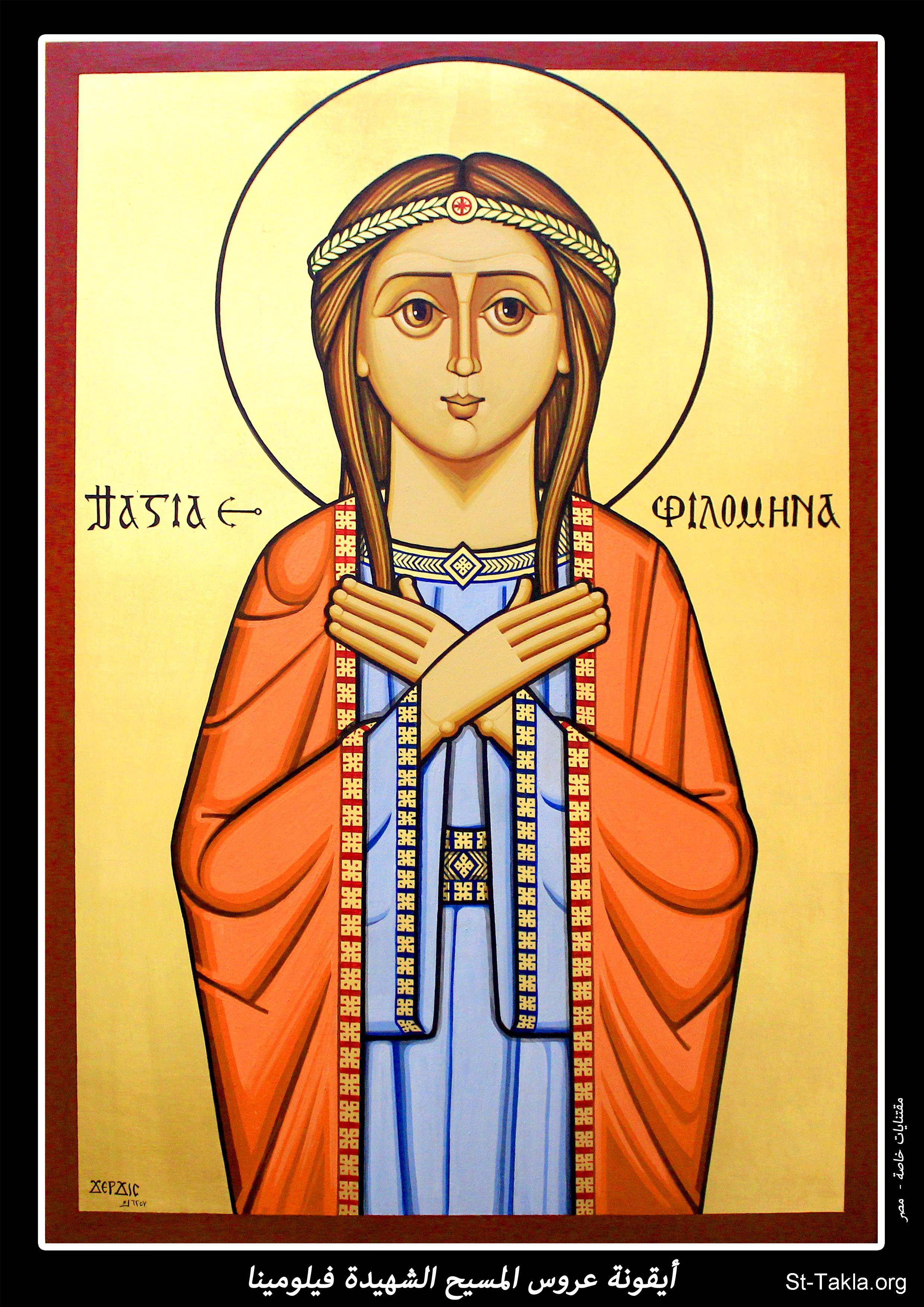 أيقونة عروس المسيح الشهيدة فيلومينا، مقتنيات خاصة، مصر، 1732 ش. (2015-2016 م. - والذي يوافق سنة 6257 حسب التقويم المصري القديم)، فن قبطي، موضوعة بإذن - رسم الفنان جرجس سمير: كاتب الأيقونة الأرثوذكسية.