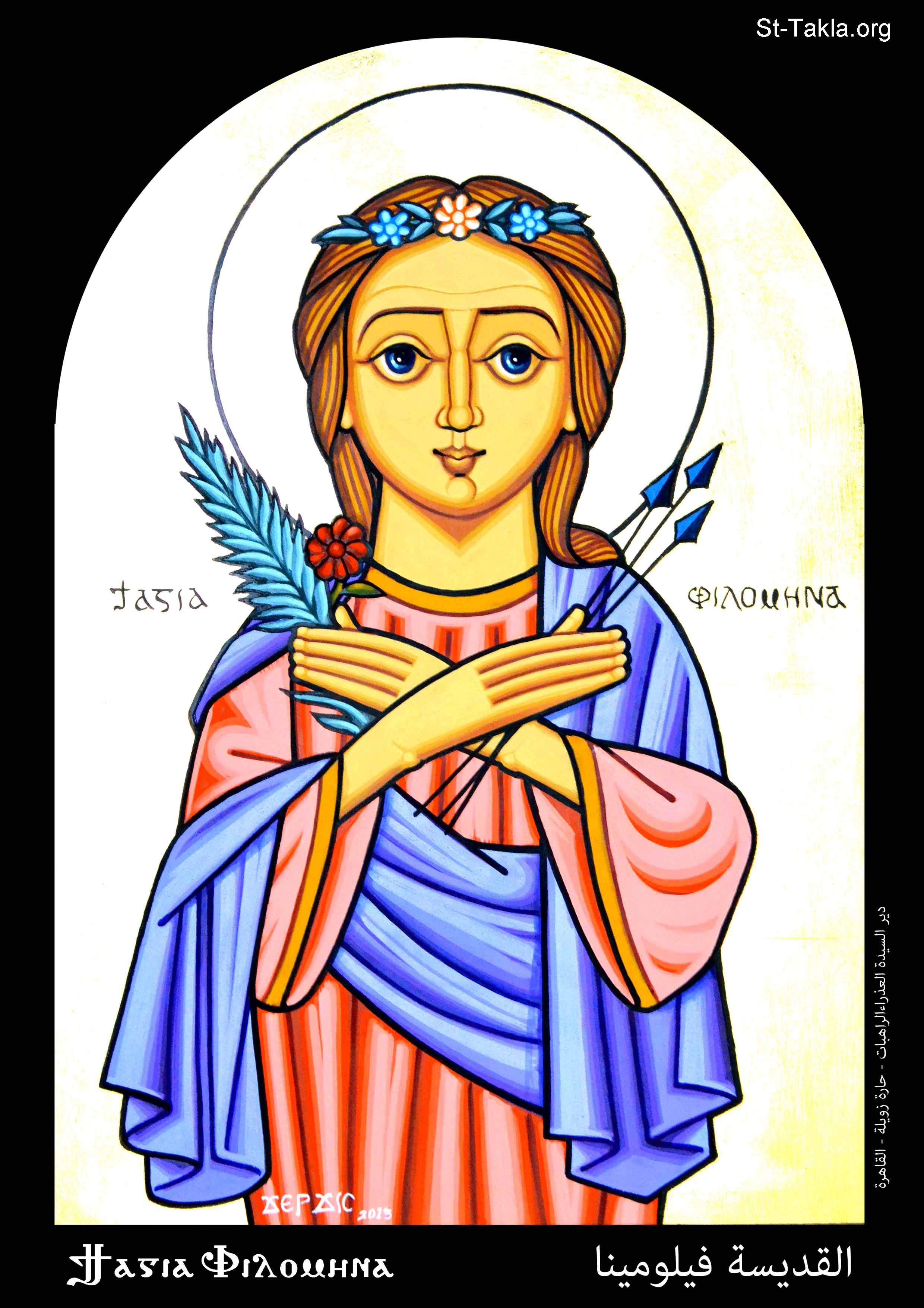 أيقونة القديسة فيلومينا، دير السيدة العذراء مريم للراهبات، حارة زويلة، مصر القديمة، القاهرة، مصر، 2013 م.، فن قبطي، موضوعة بإذن - رسم الفنان جرجس سمير: كاتب الأيقونة الأرثوذكسية.