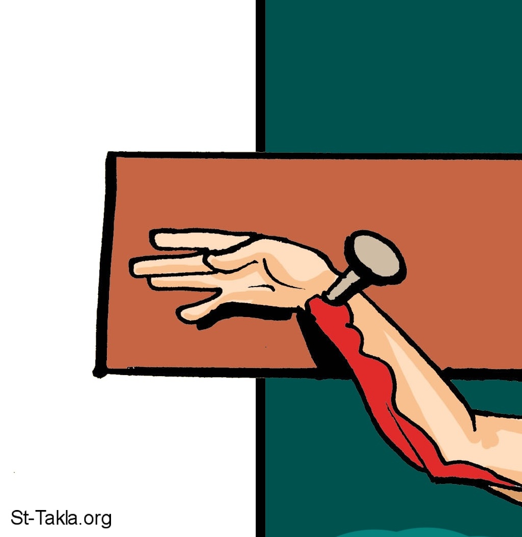 يد السيد المسيح بها المسمار، تفاصيل من صورة السيد المسيح يسوع المخلص فوق الصليب، 2011، الأدوات المستخدمة: قلم رصاص وحبر، ثم لوح جرافيك وأدوبي فوتوشوب، موضوعة بإذن - رسم الفنان مينا أنطون.