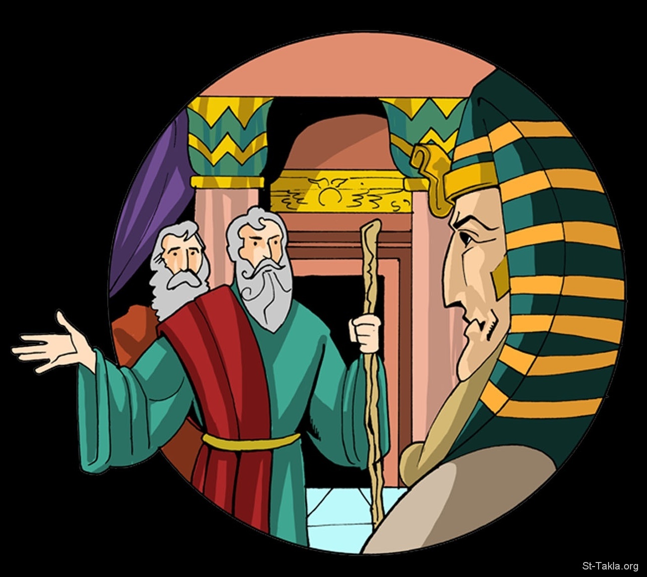 موسى وهرون يواجها فرعون (تفاصيل من قصة حياة موسى)، 2011، قلم رصاص وحبر ثم أدوبي فوتوشوب، موضوعة بإذن - رسم الفنان مينا أنطون.