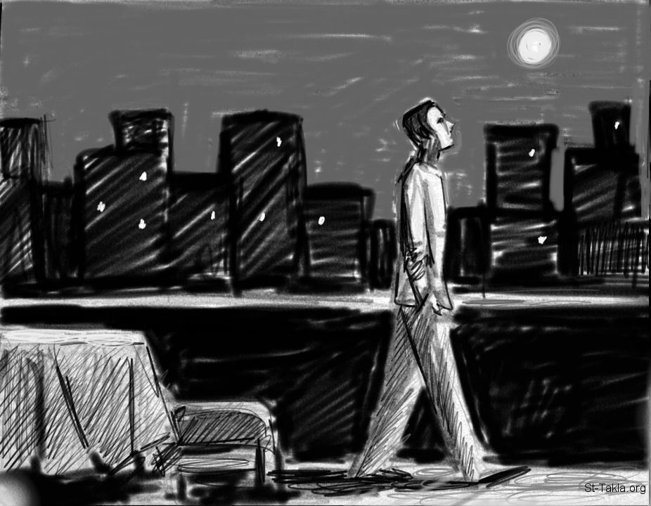 كارتون قصة قصيرة: انتظار، التأمل على السطوح، تفاصيل، موضوعة بإذن - رسم الفنان مينا أنطون.