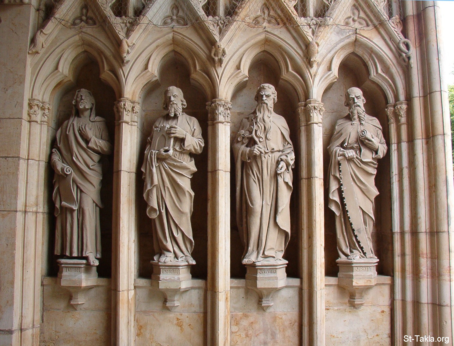 تماثيل الأنبياء الكبار الأربعة (من اليسار لليمين): دانيال، حزقيال، إرميا، إشعياء. موجودة في المدخل الجنوبي الغربي لكاتدراية سكارا، في السويد، 2005