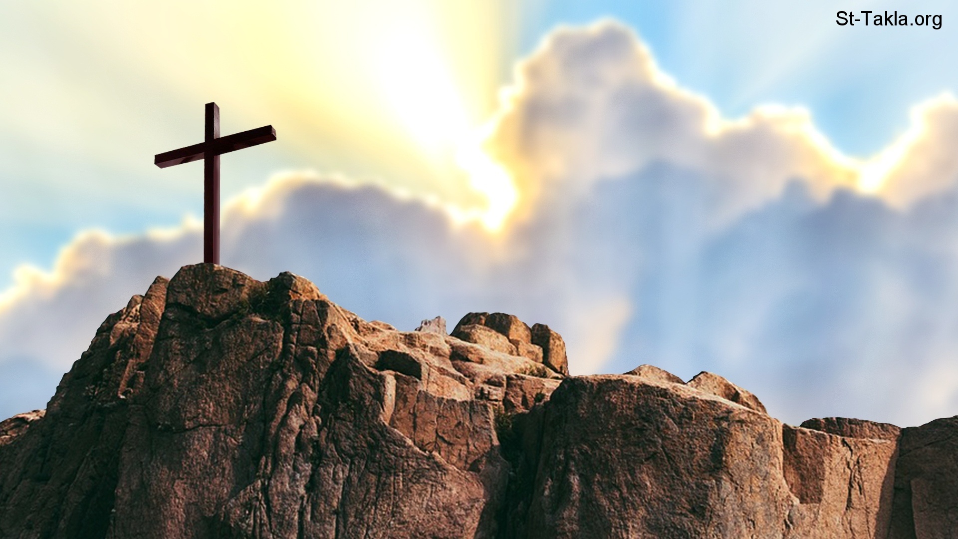 الصليب المقدس على جبل عال، وفي الخلفية سحب وآشعة الشمس، لجيفجيكوبز1990.