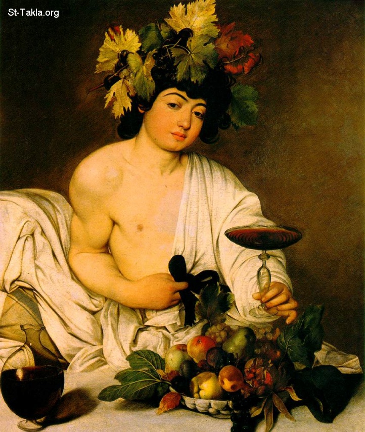 الإله باكوس (باخوس أو ديونيسيوس)، إله إغريقي وهو إله حصاد العنب وعمل النبيذ، والعبادات الجنونية والنشوة، وكان هو القوة المؤدية إلى المسرح اليوناني.. لوحة من رسم الفنان مايكل أنجيلو ميرسي كارافاجيو سنة 1595، محفوظة في أوفيزي جاليري، فلورنسا