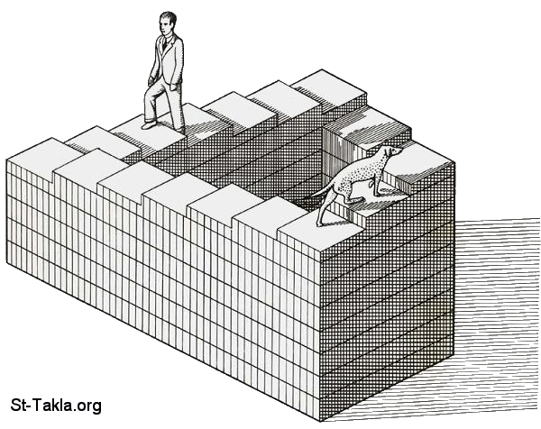 من صور الخداع البصري: السلم اللانهائي المستحيل (سلالم بينروز)، رسم الفنان لايونيل بينروز وابنه روجير بين روز - لا نمو ولا صعود.