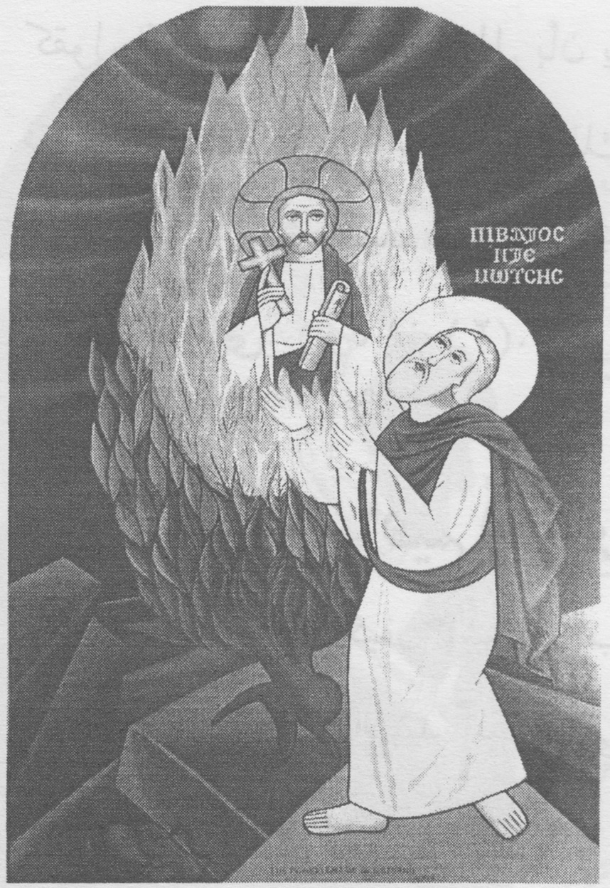 موسى النبي و العليقة المشتعلة ناراً، مع السيد المسيح - أيقونة قبطية حديثة من رسم راهبات دير الشهيدة دميانة بالبراري، مصر.