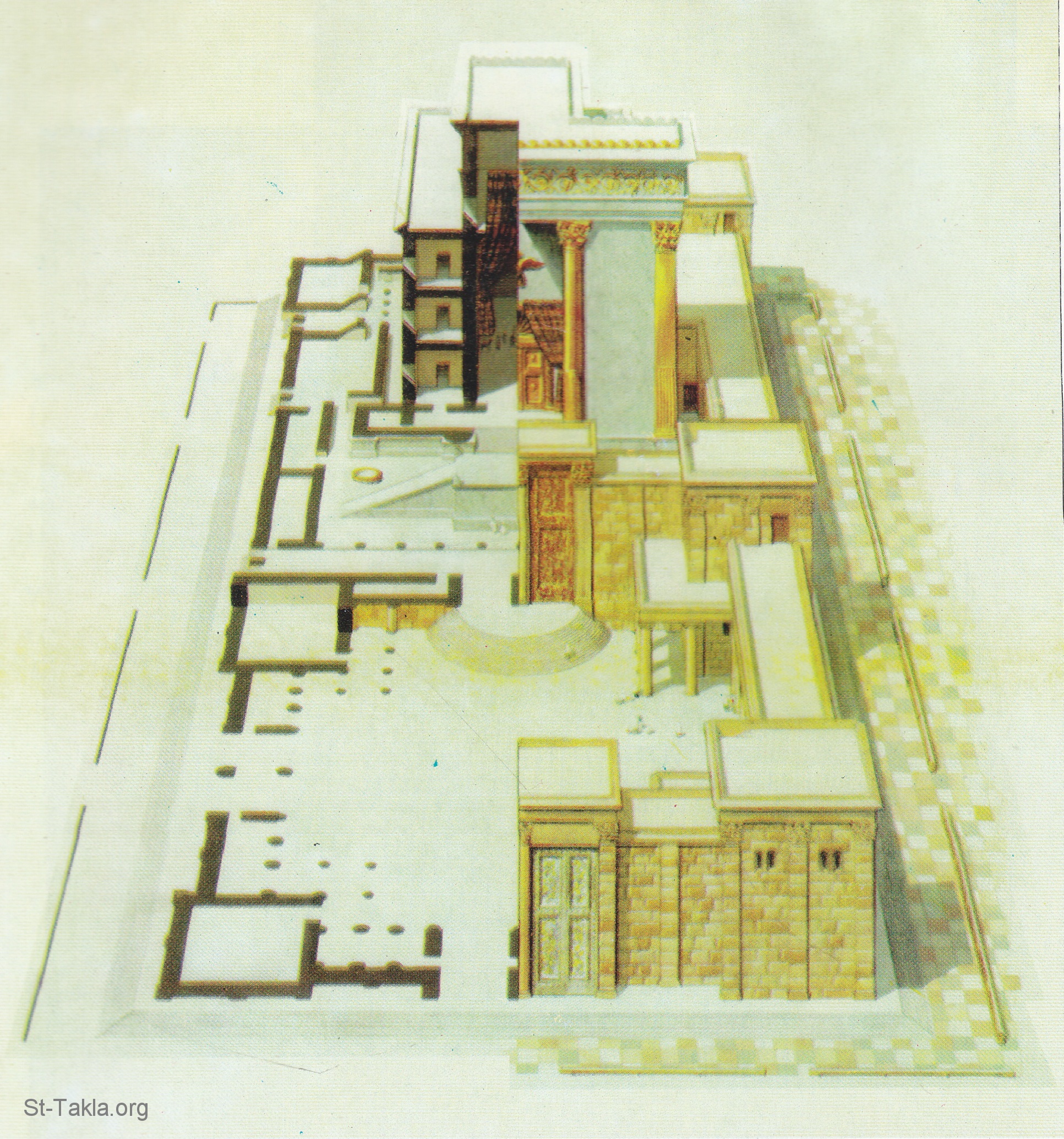 قطاع في هيكل هيرودس: الجزء الأيمن من الرسم يبين الهيكل الذي أُعيد بناؤه والدار الخارجية. والجزء الأيسر من الرسم يوضح أقسام المبنى: واجهة القدس - مدخل القدس - القدس - قدس الأقداس - مذبح المحرقة - الدار الخارجية (وهي مخصصة لرجال إسرائيل) - مدخل نيكانور - دار النساء اليهوديات.