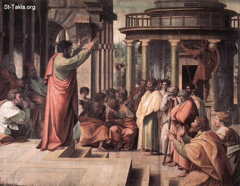 لوحة القديس الرسول بولس وهو يعظ في أثينا (عظة أريوس باغوس)، رسم الفنان رافايلو سانزيو سنة 1515، زخرفة على ورق بمقاس 390×440 سم، نسيج، محفوظة في متحف فيكتوريا وألبرت، لندن