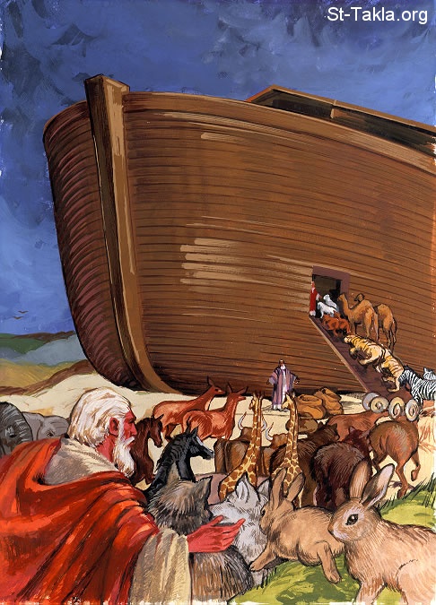 الدخول إلى فلك نوح - "ولما كان نوح ابن ست مئة سنة صار طوفان الماء على الأرض، فدخل نوح وبنوه وامرأته ونساء بنيه معه إلى الفلك من وجه مياه الطوفان. ومن البهائم الطاهرة والبهائم التي ليست بطاهرة، ومن الطيور وكل ما يدب على الأرض: دخل اثنان اثنان إلى نوح إلى الفلك، ذكرا وأنثى، كما أمر الله نوحا" (سفر التكوين 7: 6-9) - صور الإنجيل من إن إتش بي.